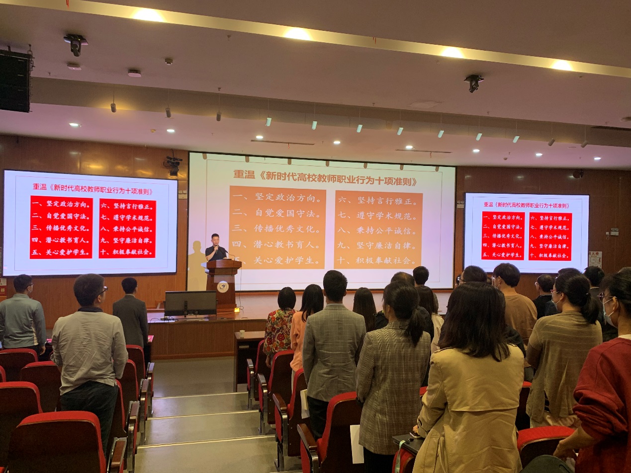 为落实院长师德师风建设第一责任人、师德师风引领示范者要求,强化担当意识,院长颜成钢在大会上做师德师风工作承诺,并带领全体教师重温《新时代高校教师职业行为十项准则》,引导全体教师更好担当起学生健康成长指导者和引路人的责任。