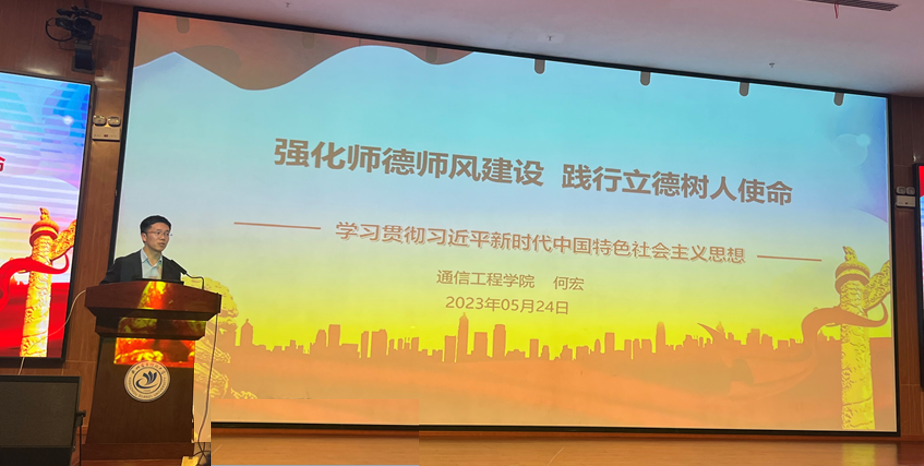 为深入学习贯彻习近平新时代中国特色社会主义思想主题教育,加强师德师风建设,落实立德树人根本任务,5月24日,通信工程学院在4教127报告厅开展师德师风专题教育活动,通过“五个一”进一步涵养师德,激发教师的责任感和使命感,推动学院立德树人工作再上新台阶。学院党委书记何宏、院长颜成钢、副院长孙闽红等领导班子成员以及全体教职工参加了此次会议,会议由院长助理滕旭阳主持。