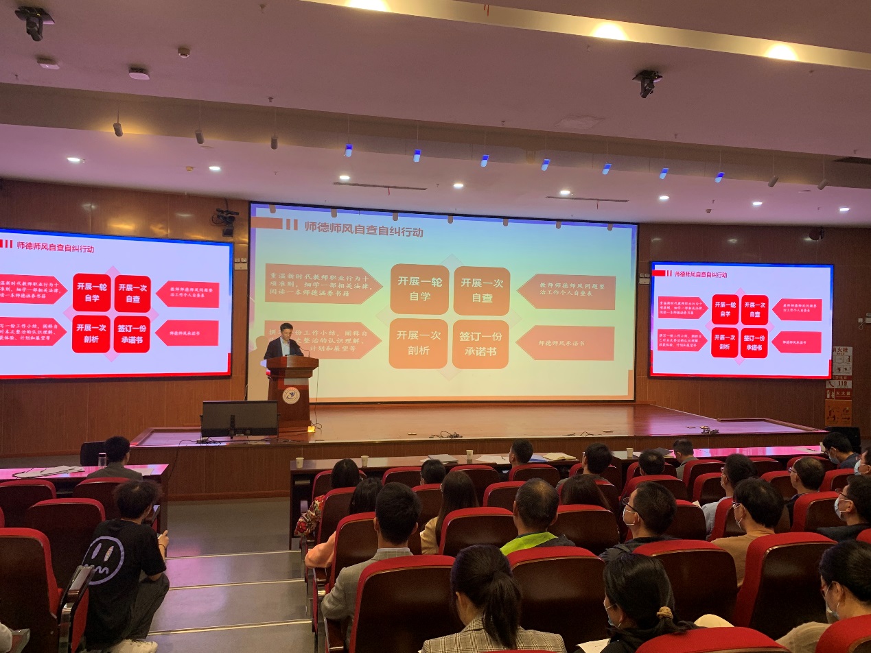 何宏书记通过师德失范典型案例,对全体教师开展警示教育,希望每位教师引以为戒,切实增强自身的思想自觉和行动自觉,坚守师德底线,防微杜渐,知敬畏、守底线,不踩红线,坚守为党育人、为国育才的初心。