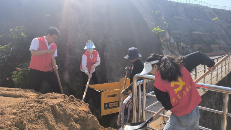 本次活动最为耗时的是填土环节。因车辆无法经过狭窄的通道,运来的泥土被临时堆在马路边。从马路到新砌的花槽,全靠大家一趟一趟地铲、运、倒。尽管费时费力,但大家毫无怨言,个个干劲十足,热情高涨,全然不顾头顶烈日和身上的汗水,全神贯注于手上的活,顺利完成了填土、种植、浇水、覆土的工作。