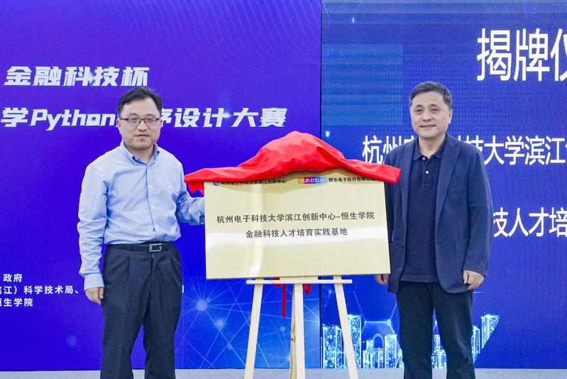 比赛现场,还举行了杭州电子科技大学滨江创新中心——恒生学院金融科技人才培育实践基地揭牌仪式。恒生电子股份有限公司党委书记、副总裁周峰和杭电滨江创新中心主任俞东进为基地揭牌。