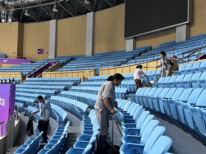 早在开学初期,后勤物业、维修服务中心便进入“战前”状态,全身心投入到亚运会保障工作中。测试赛事开始前期,各部门紧密配合,开展保障大练兵,全方位安全检查,落实物资采购、安装、补给等,从点到面、严格落实。