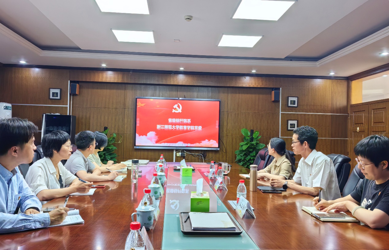 大家先来到浙江师范大学教育学院进行了交流。教育学院党委书记俞明祥、副书记王玉琴、学工办主任叶青参加了座谈。俞明祥对两个学院教师的到来表示热烈欢迎,他向大家介绍了浙江师范大学教育学院的基本情况,并以“党建引领促发展,培根铸魂育新人”为主题,详细介绍了教育学院党委作为省级标杆院系的创建工作和主要做法,以及全国百个研究生样板党支部——教育学院教育技术学硕士党支部的特色活动。网络空间安全学院王伟臻向大家介绍了网络空间安全学院的党建情况。座谈会中,与会人员就双方党建工作方面存在的短板、困惑以及主题教育推进的有效做法和成功经验进行了交流,大家表示以后要经常互动,相互借鉴,共同提高,共促发展。