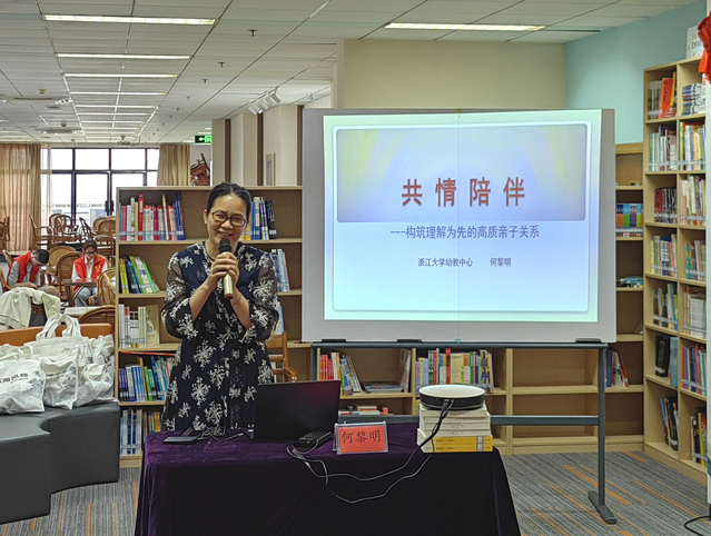 浙江大学幼儿园总园副园长、浙江大学幼教中心副主任何黎明担任亲子育儿沙龙主讲嘉宾,分享的主题是《共情陪伴——构筑理解为先的高质亲子关系》。何黎明认为陪伴孩子最重要的是共情,站在孩子的角度思考问题,感受和理解孩子的情感。别把孩子当“小孩”,他们是和我们一样的人。大人与孩子在认知事物上和价值观方面的差异,但即使孩子的认知出现偏差,也不应该一味地批判,而应该理解和包容。要蹲下来,倾听孩子,悬挂自己的“假设”,努力了解“孩子”是什么样的人。要积极智慧地与孩子互动,孩子学了什么,学到了多少,主要依赖于与他们互动的成人。聪明的父母和孩子一起学习成长,做父母是天成的,做家长是需要学习的。何黎明认为亲子阅读是陪伴孩子最好的一种方式,因此杭电图书馆打造亲子阅读区是非常好的一件事情。