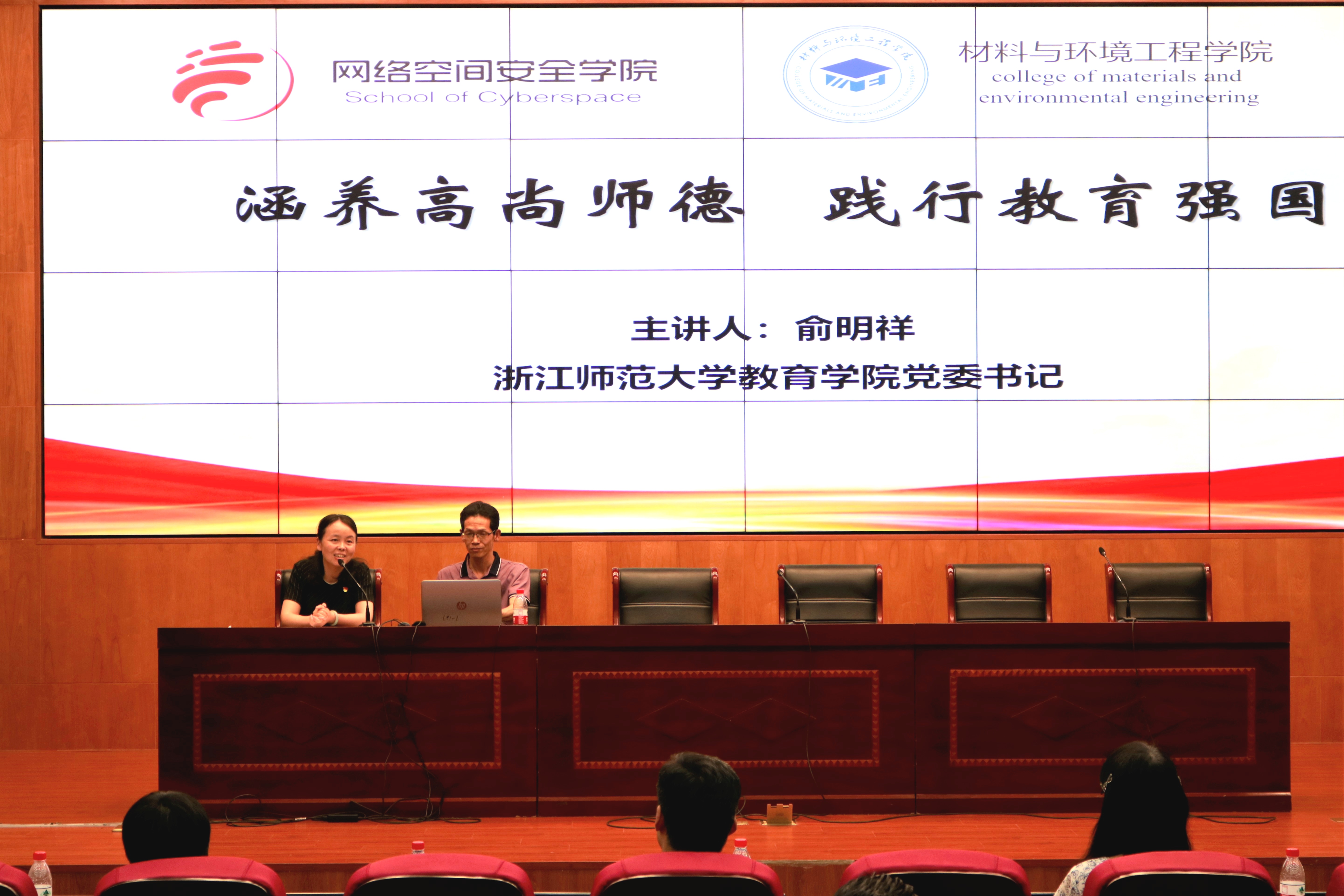 为深入开展学习贯彻习近平新时代中国特色社会主义思想主题教育,全面贯彻落实习近平总书记关于教育的重要论述,进一步强化师德师风建设,促进教师素质提升,6月8日下午,网络空间安全学院和材料与环境工程学院在信博楼多功能会议厅联合举行师德师风专题讲座,特邀浙江师范大学教育学院党委书记、浙江省高校优秀党务工作者俞明祥作报告,网络空间安全学院党委书记罗美华主持,两个学院的全体教职工参加了本次报告会。