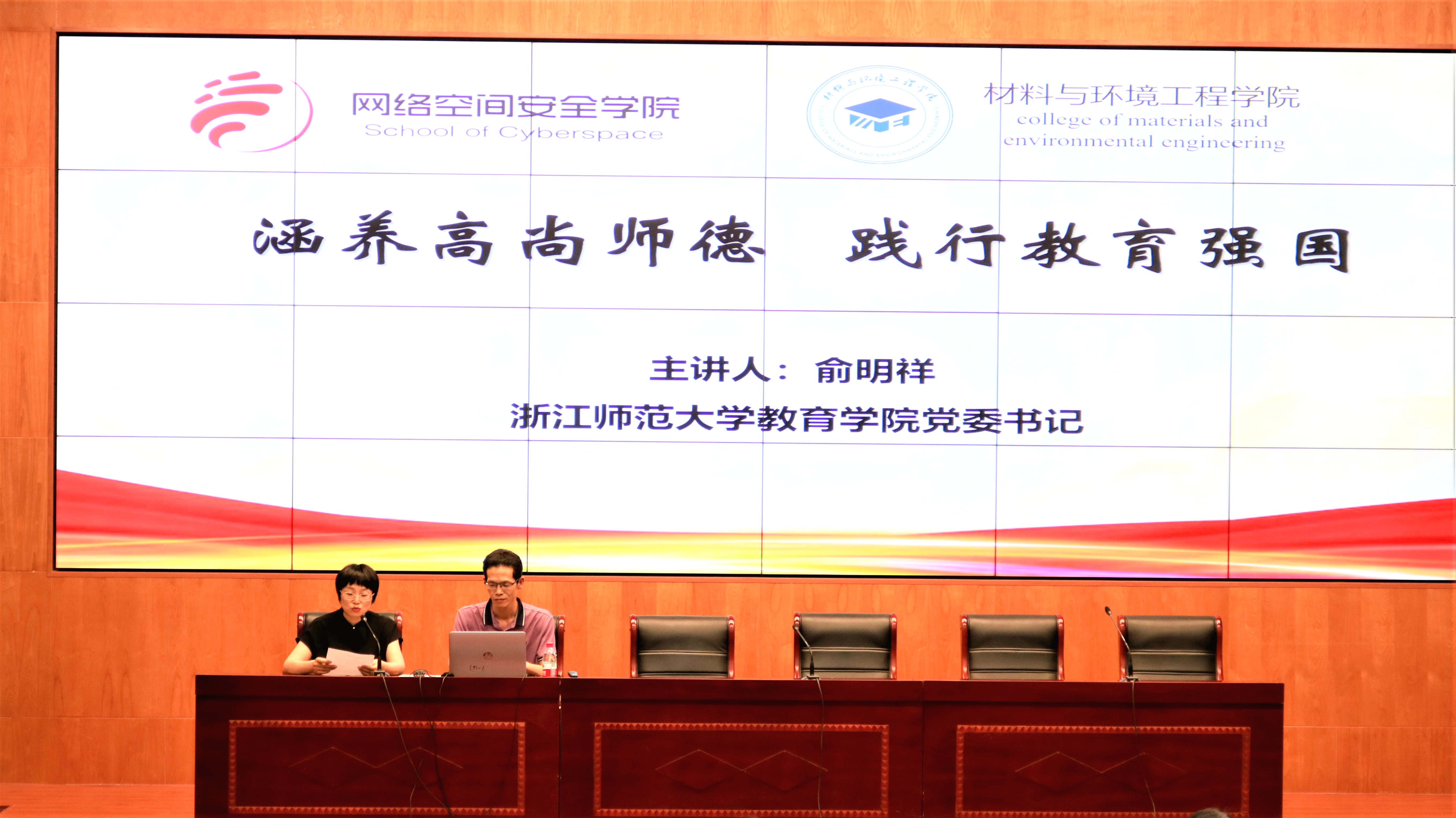 为深入开展学习贯彻习近平新时代中国特色社会主义思想主题教育,全面贯彻落实习近平总书记关于教育的重要论述,进一步强化师德师风建设,促进教师素质提升,6月8日下午,网络空间安全学院和材料与环境工程学院在信博楼多功能会议厅联合举行师德师风专题讲座,特邀浙江师范大学教育学院党委书记、浙江省高校优秀党务工作者俞明祥作报告,网络空间安全学院党委书记罗美华主持,两个学院的全体教职工参加了本次报告会。