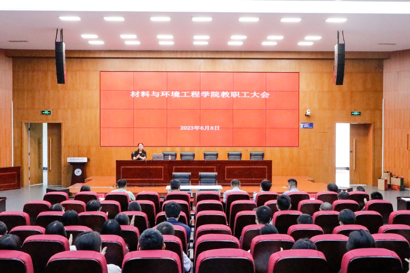 6月8日下午,材料与环境工程学院在信博楼多功能会议厅召开全体教职工大会,部署2023年全面从严治党、师德师风建设有关工作。会议由学院党委书记沈莉、副书记宋云峰主持。学院党政领导班子成员、全体教职工出席会议。