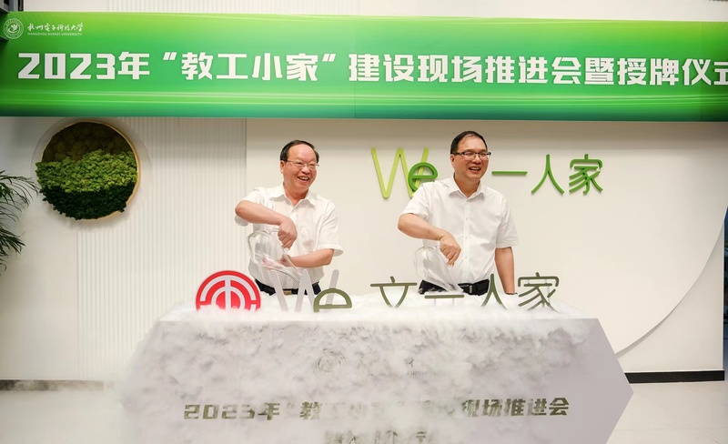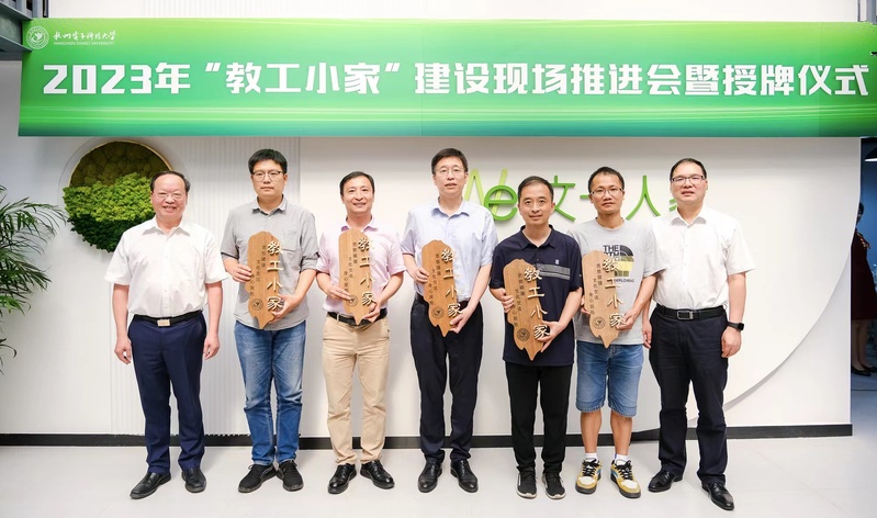 推进会上,在共同观看《共建一个家 共享和谐校——教工小家建设掠影》的短片后,朱泽飞和王玉庆为2022年度通过学校验收的自动化学院分工会、管理学院分工会、计算机学院分工会、材环学院分工会、信息工程学院分工会、通信工程学院分工会、人艺数法学院分会、经济学院分工会、外国语学院分工会、机械工程学院分工会、继续教育学院分工会等11个“教工小家”授牌。随后,朱泽飞和王秋兰共同启用了后勤分工会新建的教工小家“文一人家”。