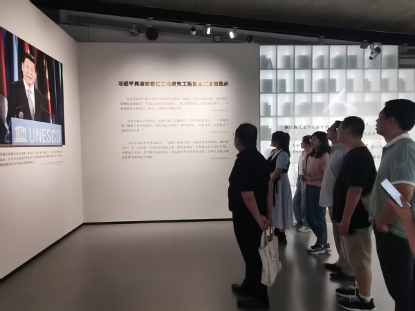杭州国家版本馆,又名文润阁,是中国国家版本馆杭州分馆。在极具江南宋韵之美的青绿色系建筑里,支部党员教师开启了一场追溯文脉之旅,依次参观了“文献之邦——江南版本文化概览展”“盛世浙学——浙江文化研究工程成果展”“千古风流——浙江历史文化名人展”和“潮起之江——‘重要窗口’主题版本展”。大家领悟了版本的丰富魅力,深刻感受到了中华文化的深厚底蕴和中华文脉的时代价值,深入了解了浙江深厚的历史渊源与文化脉络,领略了“八八战略”给之江大地带来的深层次、历史性变化。