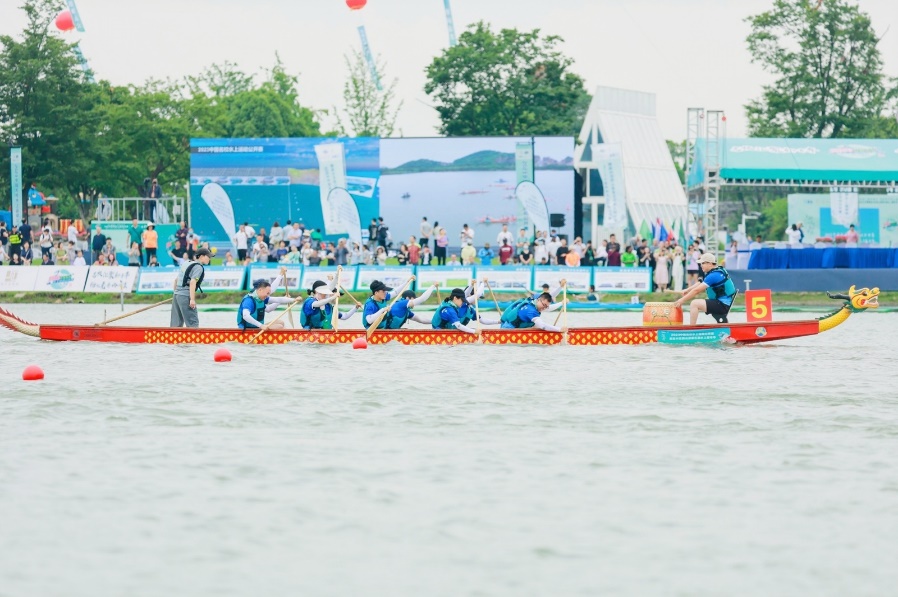 6月3日,在2023中国名校水上运动公开赛(湖州)上,我校龙舟队与清华大学、北京大学、浙江大学、上海交通大学等名校同湖竞技,取得了高校B组三等奖的好成绩。