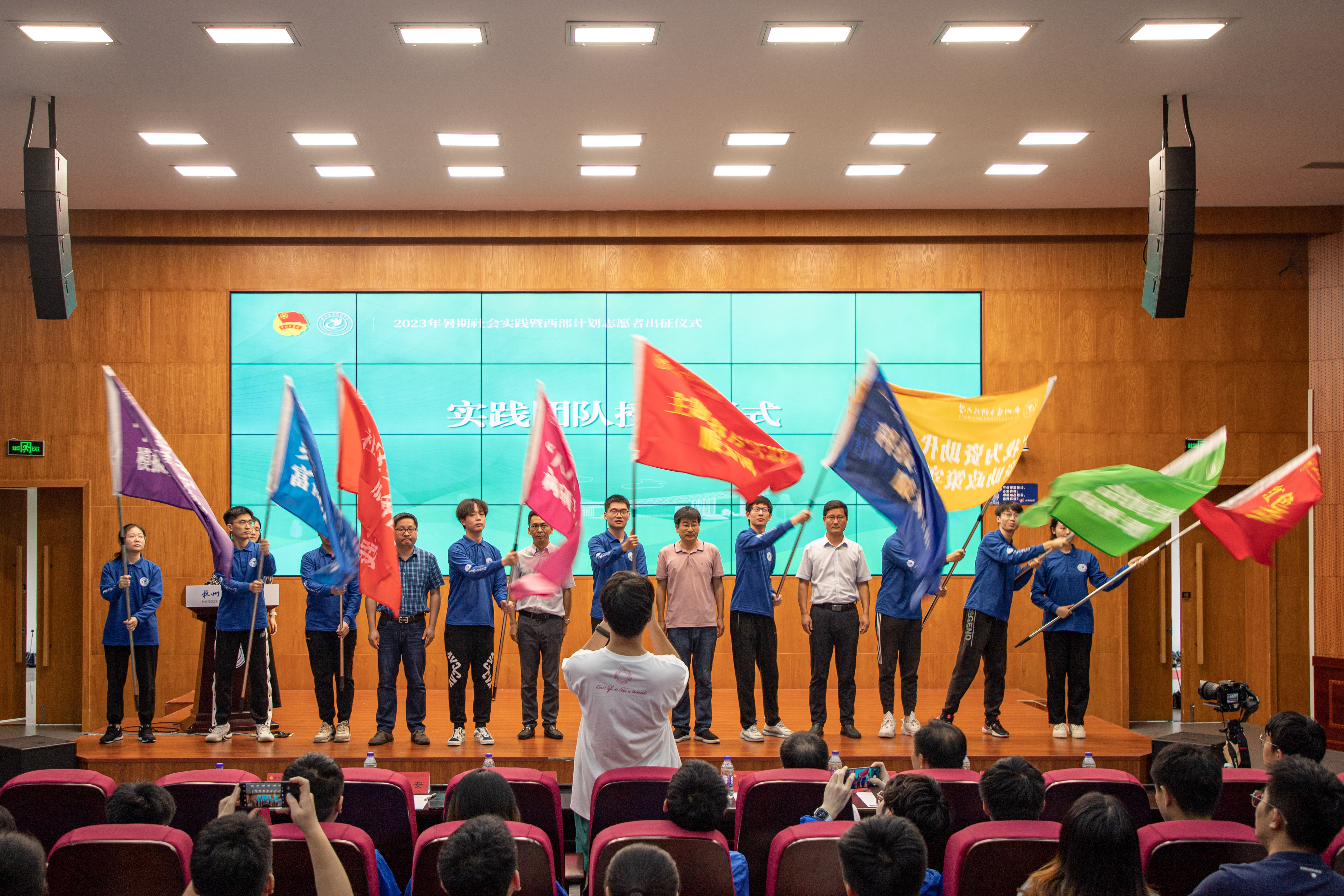 出征仪式上向参加主题教育、红色基因传承、乡村振兴和共同富裕、科技创新、社区实践、民族团结、“八八战略”专项调研、模拟政协提案、“我为资助代言”9大主题实践的学生代表授旗。