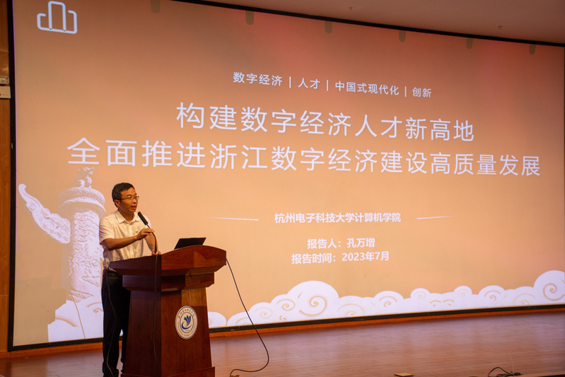 孔万增围绕“构建数字经济人才新高地,全面推进浙江数字经济建设高质量发展”为大家带来了一场生动的主题教育党课。孔万增对当前所处的数字经济时代进行了背景介绍,并针对新兴产业及浙江省人才发展现状进行了剖析,从高校层面提出了“引得进,留得住,用得好”的人才培养计划,强调大家作为新时代的杭电计算机青年人,广大师生应肩负着建设数字经济强国的重任和担当,胸怀远大的理想和抱负,拥有创新精神和实践能力,站稳人民立场,坚持科技为民、科技报国,为国家0到1的科技飞跃工作努力贡献自己的力量。