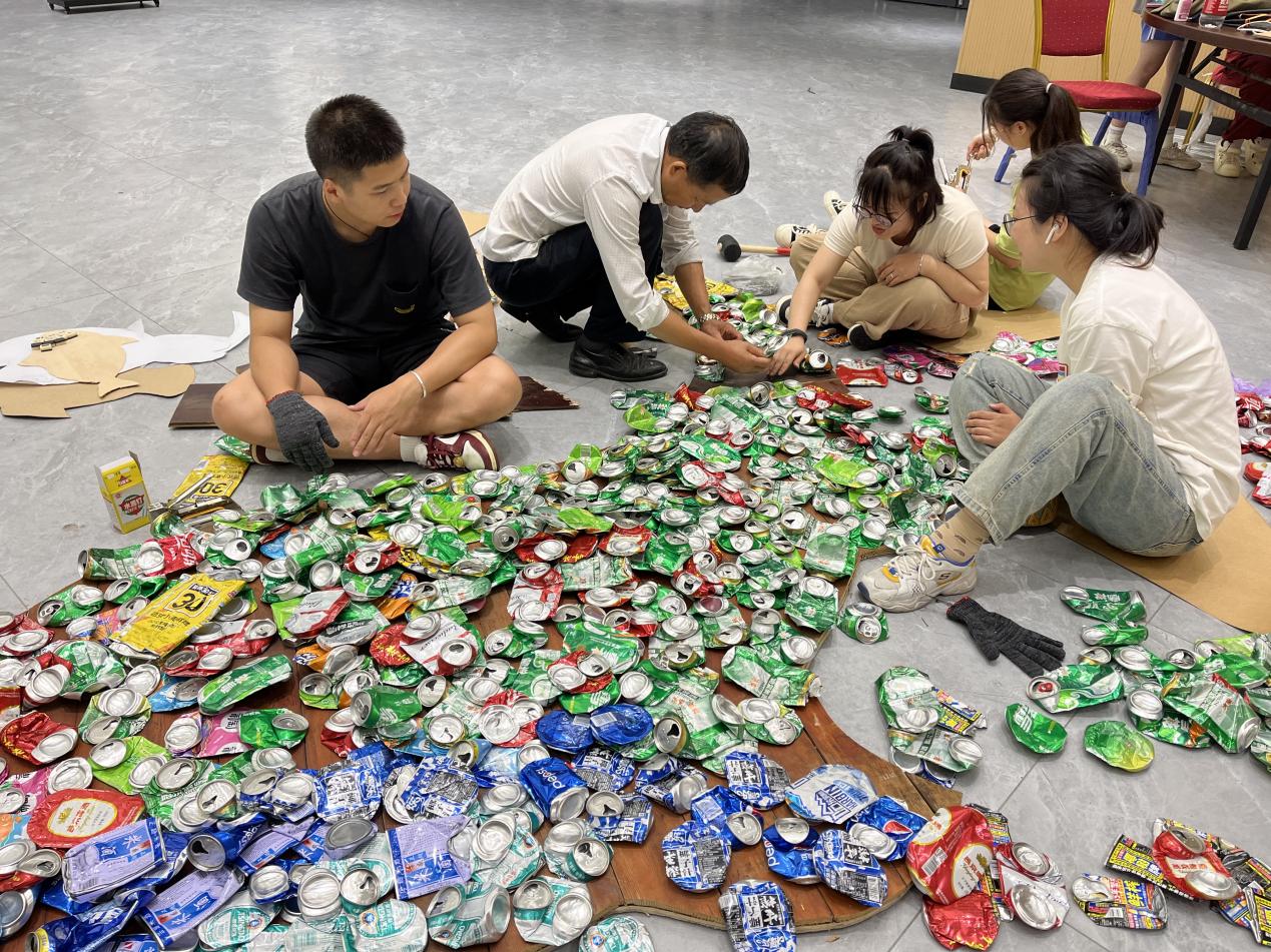 (“花开贤庠 渔你有约”艺术实践团通过废弃物再利用,创作海洋鱼群艺术装置,打造乡村特色记忆点)