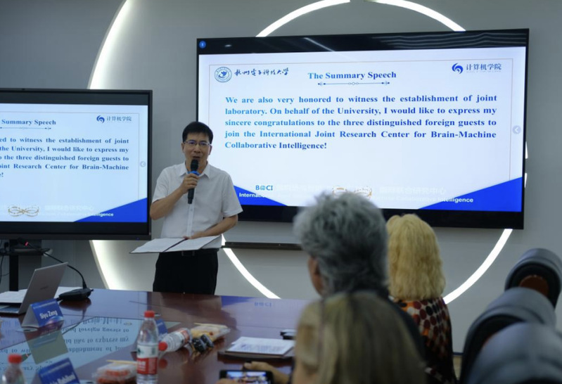 7月29日上午,脑机协同智能技术国际联合研究中心中意联合实验室成立暨讲座教授聘书授予仪式在杭电下沙校区第一教学楼三楼学术报告厅隆重举行。校党委副书记戚明钧、国际联合研究中心主任戴国骏教授、西班牙穆西亚大学教授、西班牙皇家医学院院士Maria Trinidad Herrero、意大利罗马大学教授Fabio Babiloni、意大利BrainSigns公司董事长Arianna Trettel以及国际联合中心的师生代表们出席仪式,仪式由计算机学院党委副书记张桦主持。