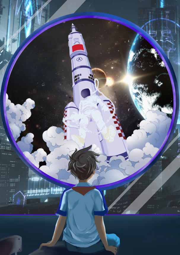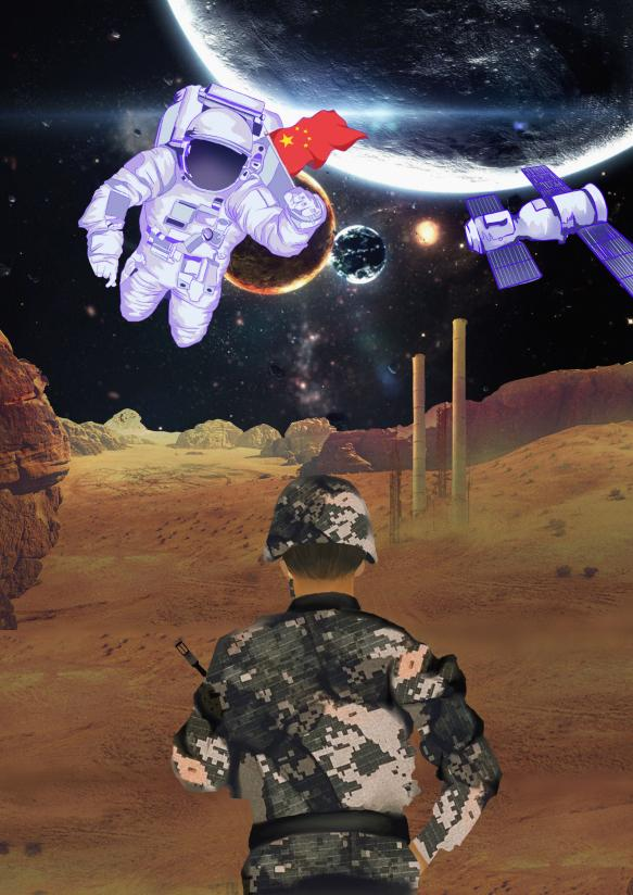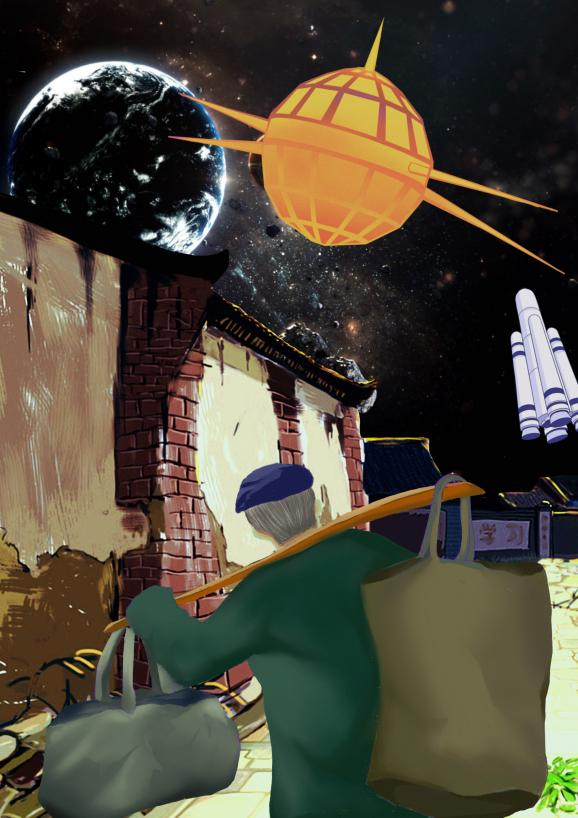 为了纪念1978年至今中国改革开放进入第三十个年头,经济取得举世瞩目之发展,中国的航空航天事业发生翻天覆地之变化,作者创作了系列插画作品《航空三十年》。回望往昔,中国航天从上世纪50年代起东方红一号的成功发射,到如今载人航天工程和绕月探测工程的蓬勃发展,创作的三张作品,分别以乡村中的老人、戍守边疆的青壮年士兵、城市中的孩童这三种视角,带领观众遥望中国的太空探索事业。三个时期,三种视角,三种身处环境,回忆与见证中国航天、中国经济、祖国综合国力在短短几十年间的的巨大变化。