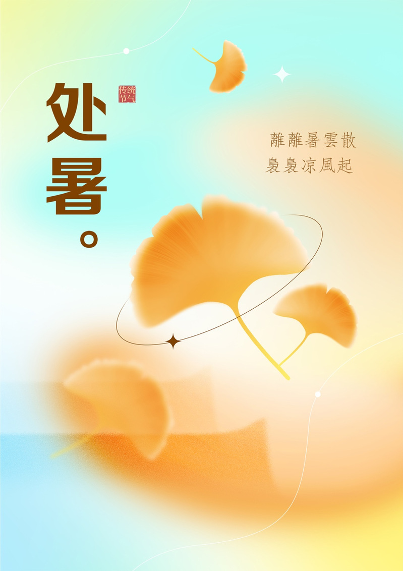 该幅海报以处暑节气为主题,亮丽橙黄色的枫叶元素和弥散风格表现出轻盈、自然的动势。设计中运用了点线面元素,通过点的集合和线条的勾勒,呈现出栩栩如生的枫叶形态,橙色的枫叶与天蓝色的背景形成对比,凸显了枫叶的美丽和独特。整个设计风格简洁明快,色彩鲜艳,给人以节气的美好和自然的魅力。