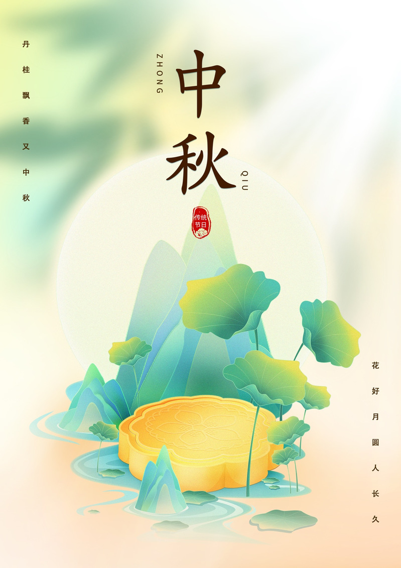 设计说明:该幅海报以中秋节为主题,融入圆月、月饼和荷叶等传统元素,传达节日祝福和团圆美好情感。海报采用简约明快的设计风格,以黄绿色调为主,体现团圆欢乐的喜庆氛围。每一个元素都有其独特的美满象征,同时也相互呼应,带来一种温馨的视觉感受。整个设计符合中秋节的旋律和特点,同时也传递了传统文化的魅力和价值。