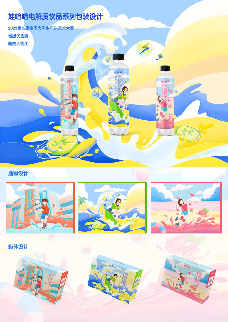 设计说明: 该系列设计以“增加活力,奋勇向前”为主题,结合冲浪、网球、沙滩排球运动场景进行娃哈哈电解质饮品系列包装设计。以手绘插画风格进行画面绘制,在运动场景中融入饮品的钾、钠等电解质离子,使得画面人物状态更具活力,体现年轻人运动、健康的理念。运用动感、明快的色彩搭配,以柠檬、西柚、蔓越莓的颜色为主色调,与场景的果味以及人物动态相结合,同时契合该系列饮品补充电解质、多效补水、等渗技术补水的产品卖点,包装整体视觉设计吸引消费者的购买。