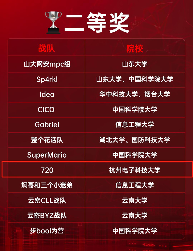 杭州电子科技大学网络空间安全学院崔婷婷副教授指导,2022级网络空间安全专业研究生凌清,2021级人工智能安全专业本科生龚思嘉、胡宏韬组成的团队荣获二等奖。