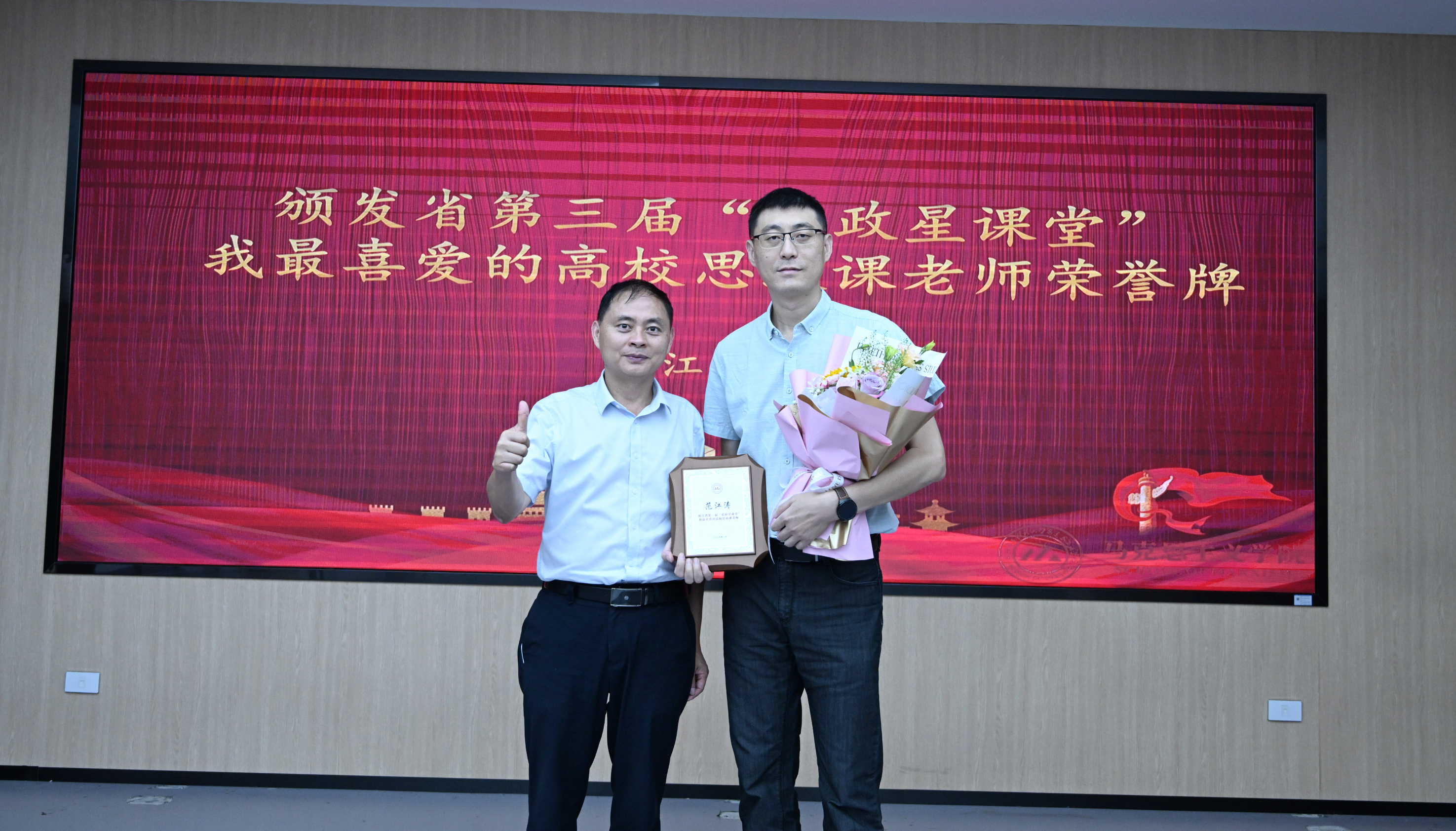 在教师节荣庆仪式阶段,学院党委书记刘孝菊带领学院新入职教师庄严宣誓,誓言忠于党的教育事业,贯彻党的教育方针,履行教师的神圣职责,做有理想信念、有道德情操、有扎实知识、有仁爱之心的好教师,并为新教师颁发新入职教师纪念碑、为新入职教师学术导师颁发聘书;学院院长王海稳为任教三十年教师颁发了纪念牌;学院副院长黄岩为浙江省第三届“思政星课堂”我最喜爱的高校思政课老师范江涛副教授颁发了荣誉牌。