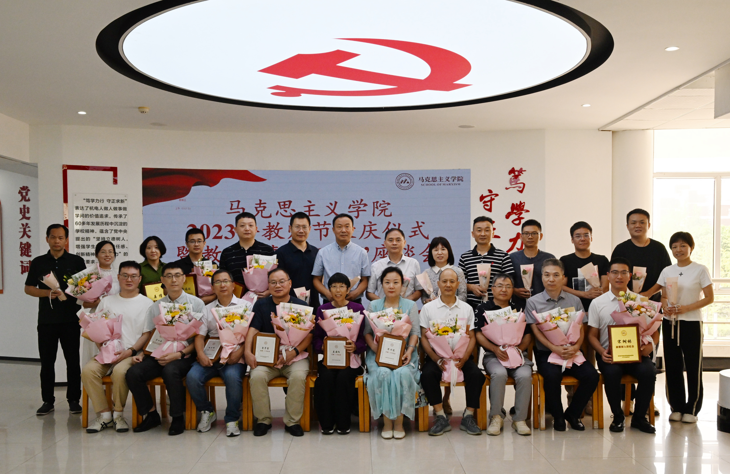 座谈会上,刘孝菊代表学院党委向全院教师致以节日的祝福和诚挚的问候,特别致敬一直坚守在杭电、在马克思主义学院、在思政课教学一线从教30年的好老师。王海稳对全体教师的辛勤付出和努力拼搏表示感谢,并希望全体教师时刻牢记习近平总书记对思政课教师提出“政治要强、情怀要深、思维要新、视野要广、自律要严、人格要正”的“六要”要求,站稳三尺讲台,把思政课讲好,推动马克思主义学院高质量发展,用实际行动践行习近平新时代中国特色社会主义思想。