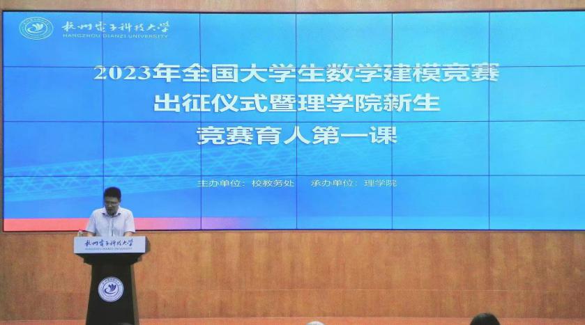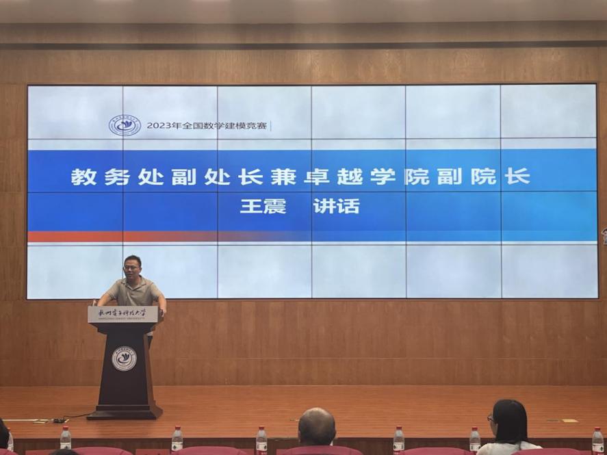 王震作动员讲话,他介绍了数学建模竞赛作为杭电四大支柱赛事,近年来取得的良好成绩,期待参赛选手再创辉煌与佳绩。