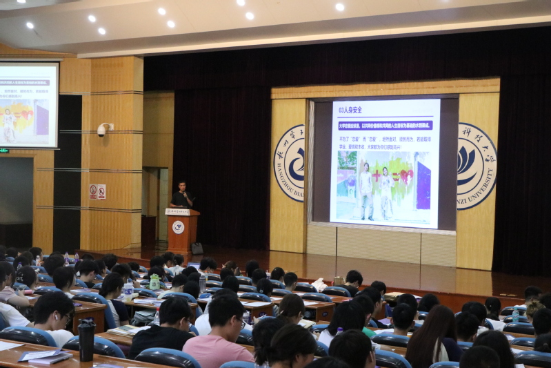 9月7日下午在科技馆二楼报告厅,保卫处王振海通过一个个生动真实的典型案例,向新生们介绍了防诈骗、用电安全、交通安全等系列的安全教育知识。