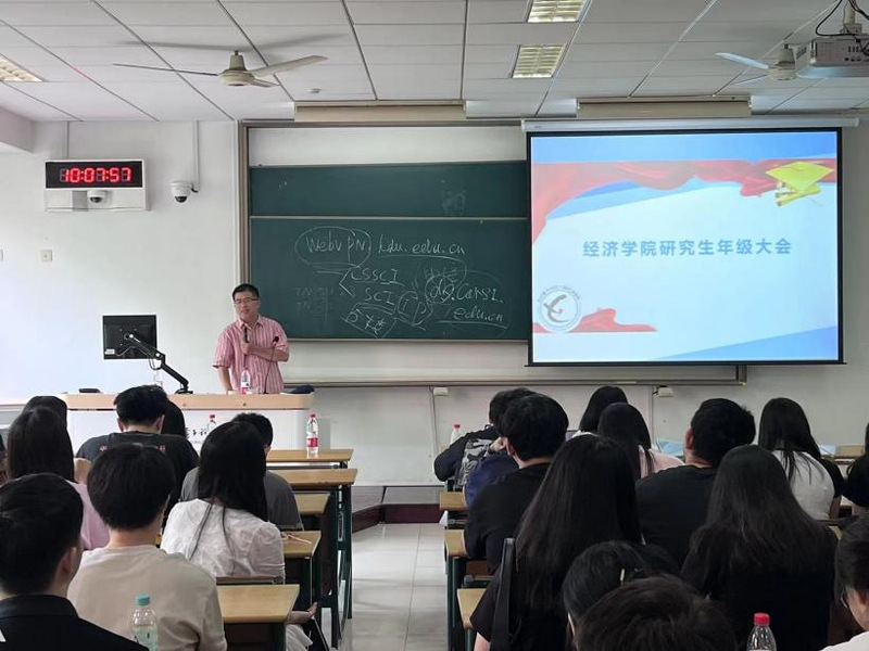 经济学院的老院长、老书记原研究生院长都红雯分享了学院杰出校友姚天舒的故事,引导新生们培养积极的心态,迅速适应研究生阶段的学习和生活,制定合理的学业发展规划,在经济学院实现自己的人生梦想。