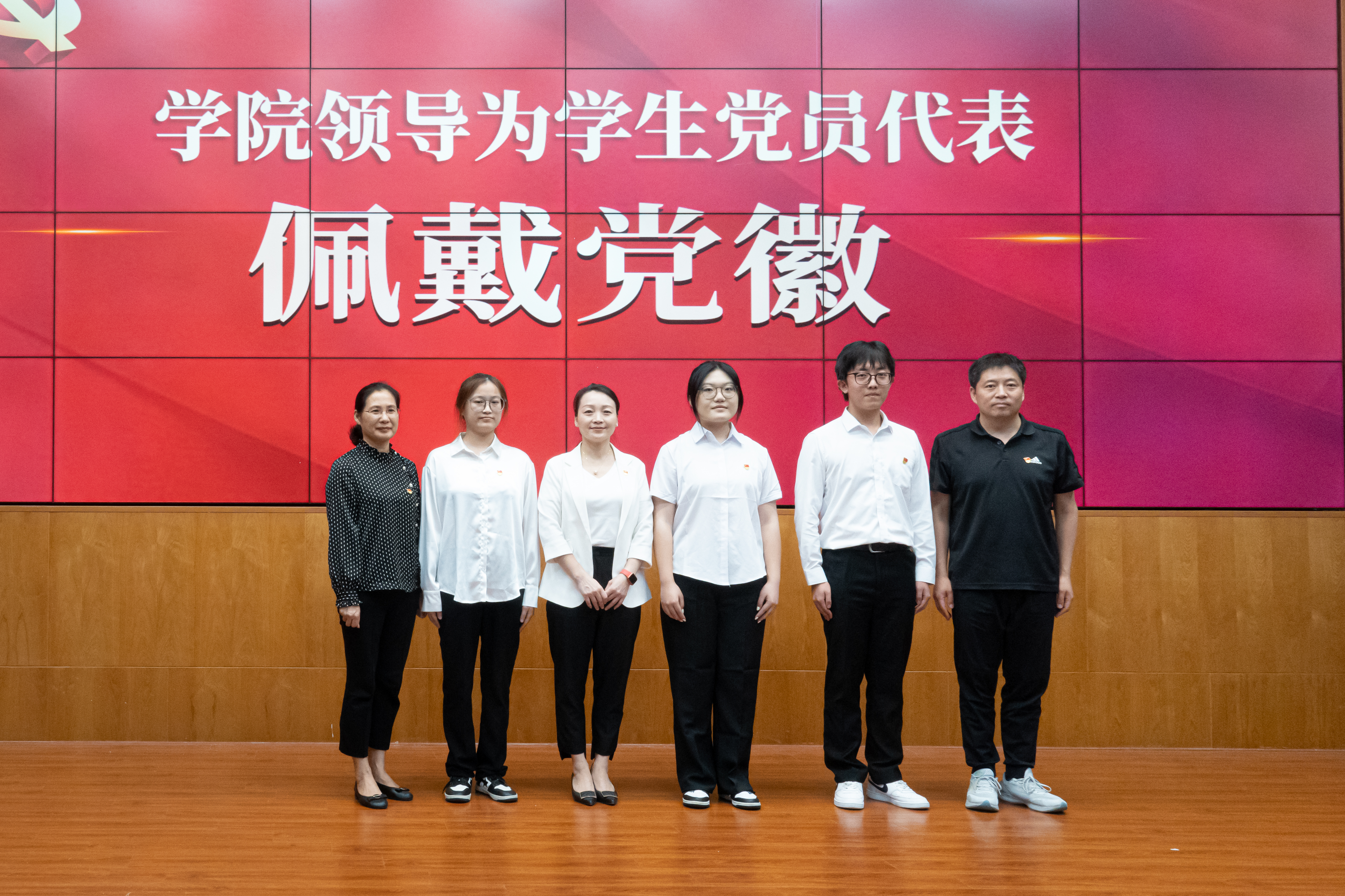 入党誓词凝结着党的初心和信仰,共产党员应当牢记入党时的铮铮誓言。冯瑛、马化龙、丁伟妃为三位学生党员代表佩戴党员徽章,刘洋带领25名学生党员重温入党誓词,誓词的思想入脑入心,成为凝心聚力的精神力量。