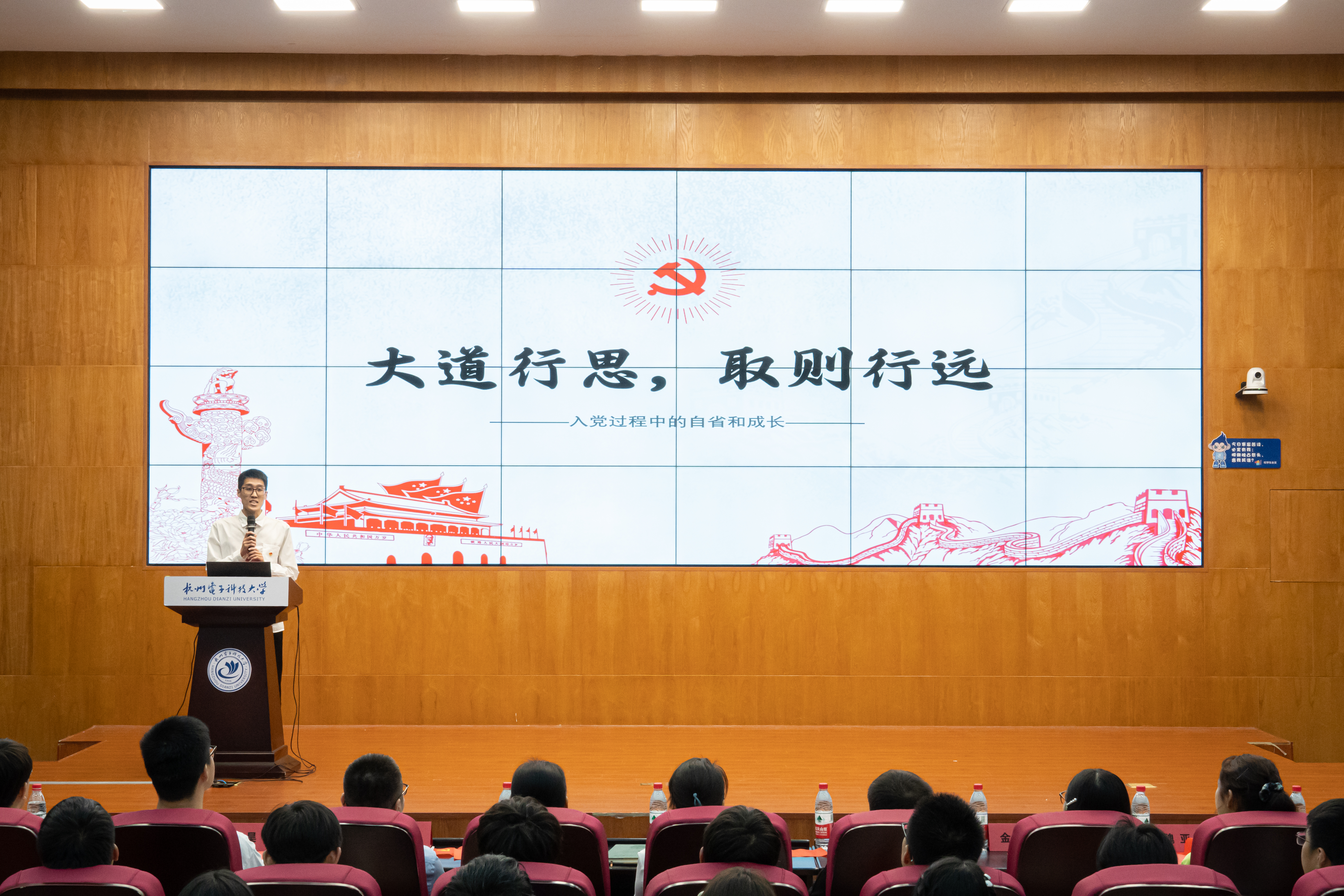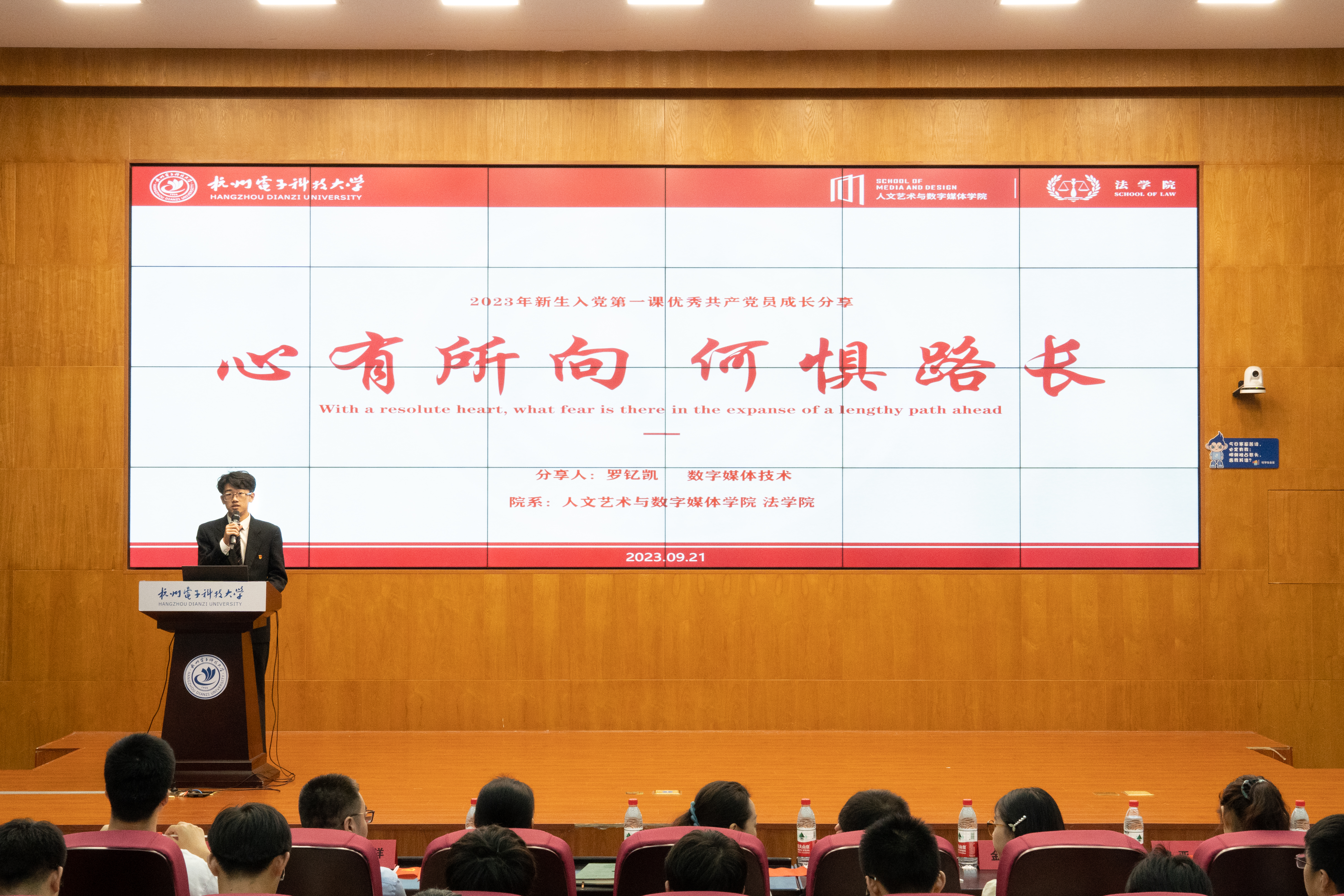 优秀学生党员代表俞可扬、罗钇凯从入党过程中的自省和成长讲起,激励新生肩负新时代青年的责任与担当,以党员的标准要求自己,努力学习专业知识,从各方面增强自己能力的同时,在身体力行中点燃奉献的青春之火。