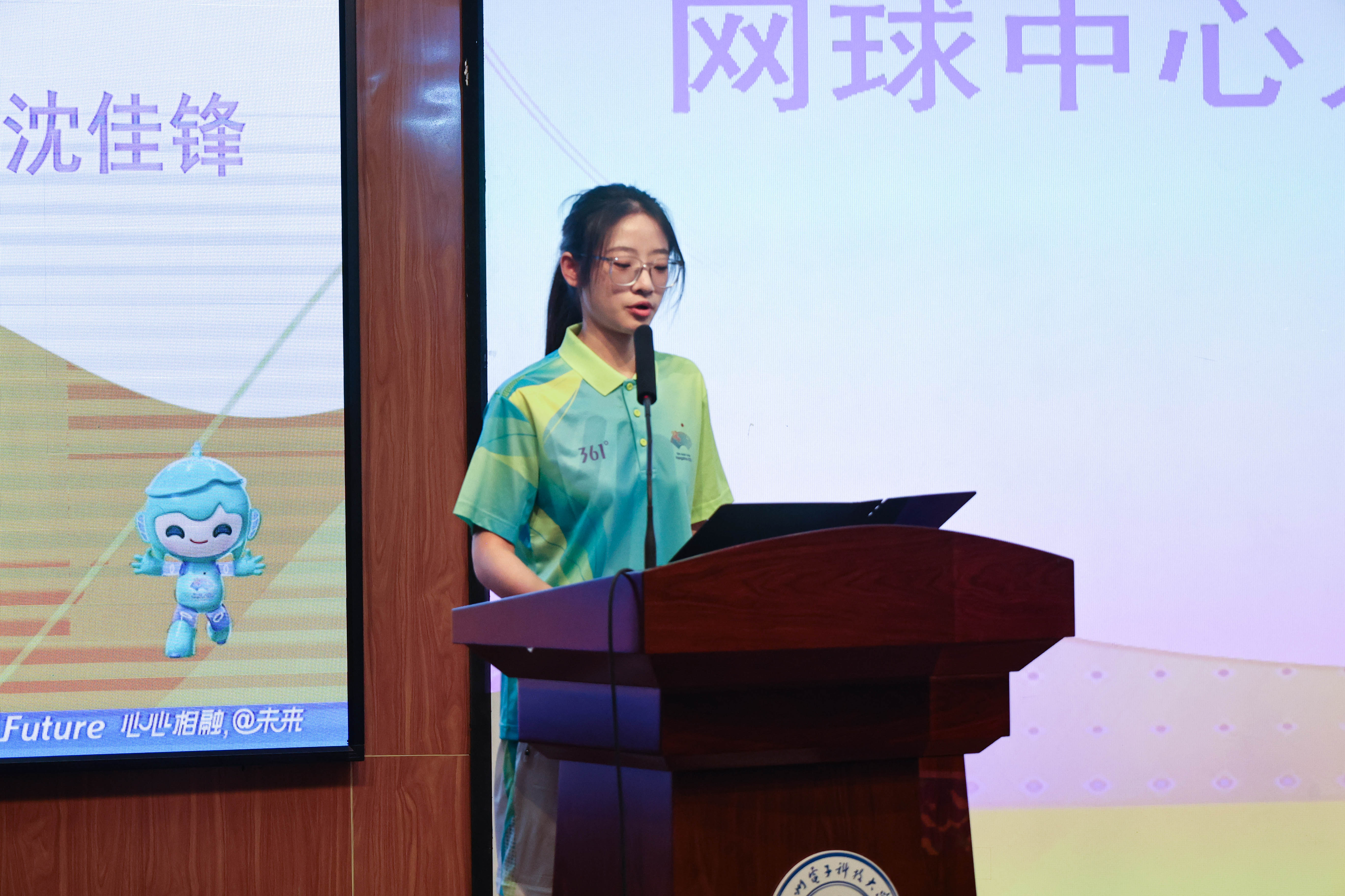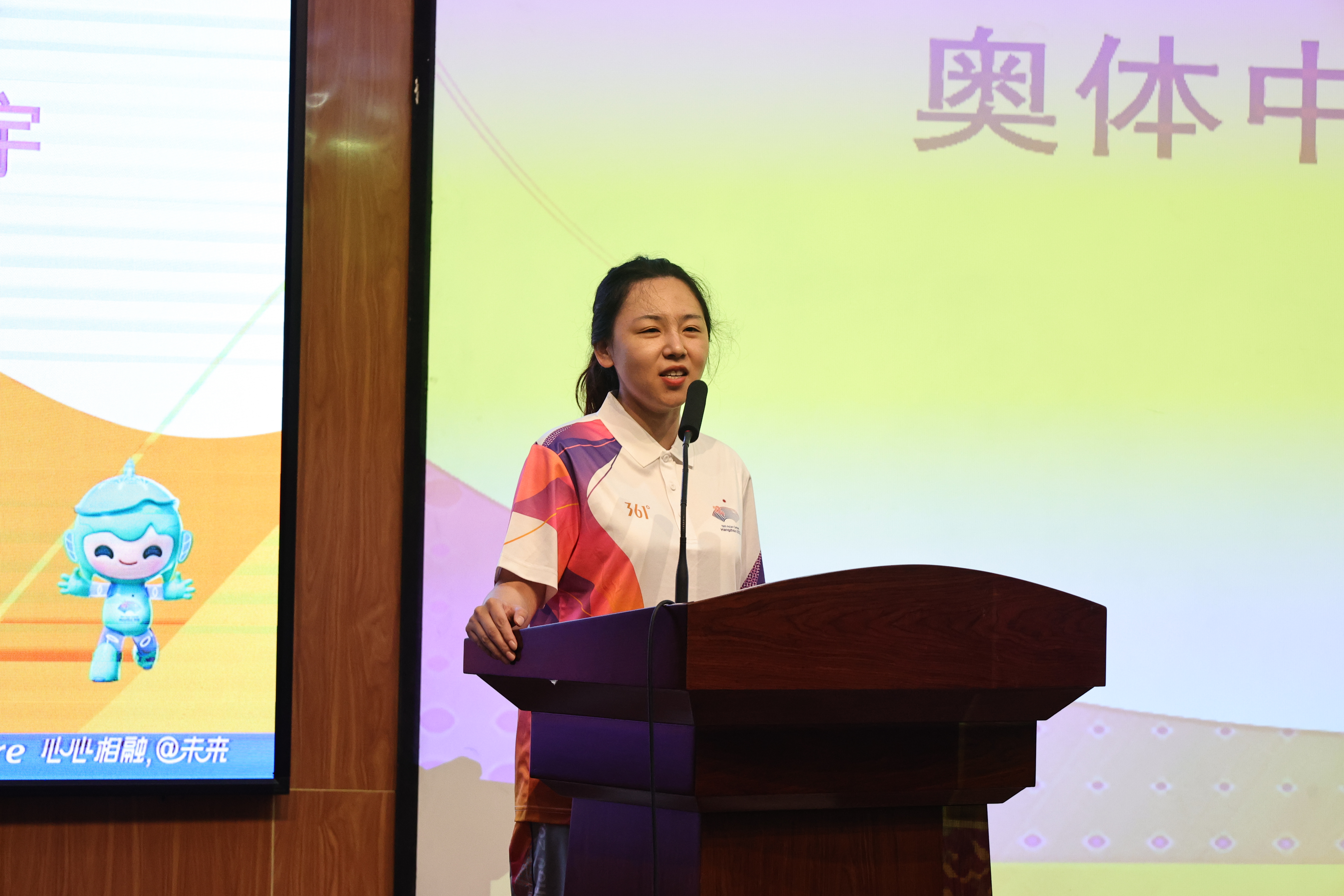 王晓宇作为教师代表发言,她首先感谢了学校、学院对志愿者队伍的关心和爱护,感谢志愿者们对于亚运赛事的无私奉献,同时鼓励志愿者们牢记老校长“国家大事,千万尽力”的嘱托,秉承着无悔付出的信念,以饱满的热情和良好的状态投入到亚运服务中去,为举办一届成功的亚运会而努力奋斗!