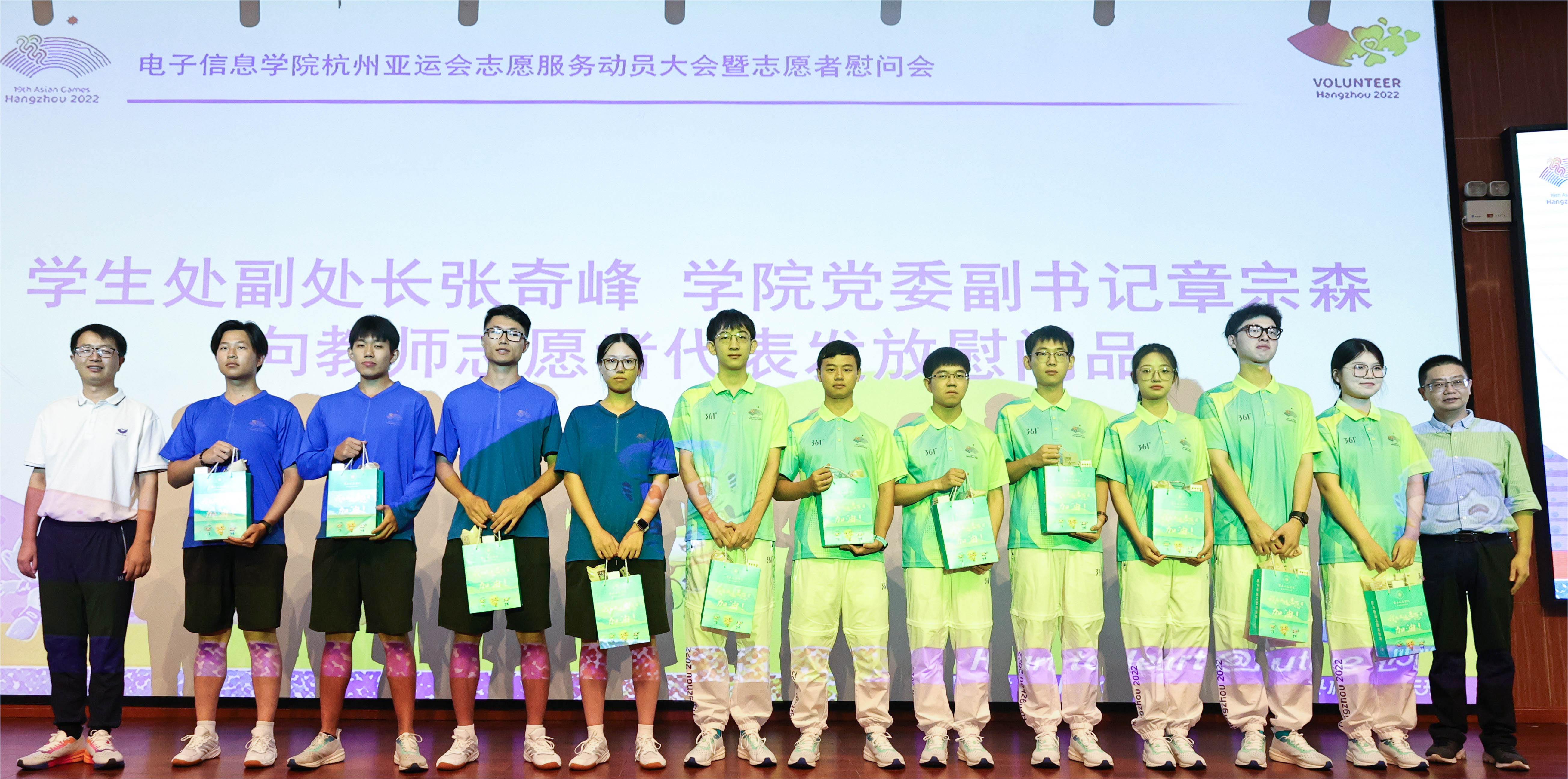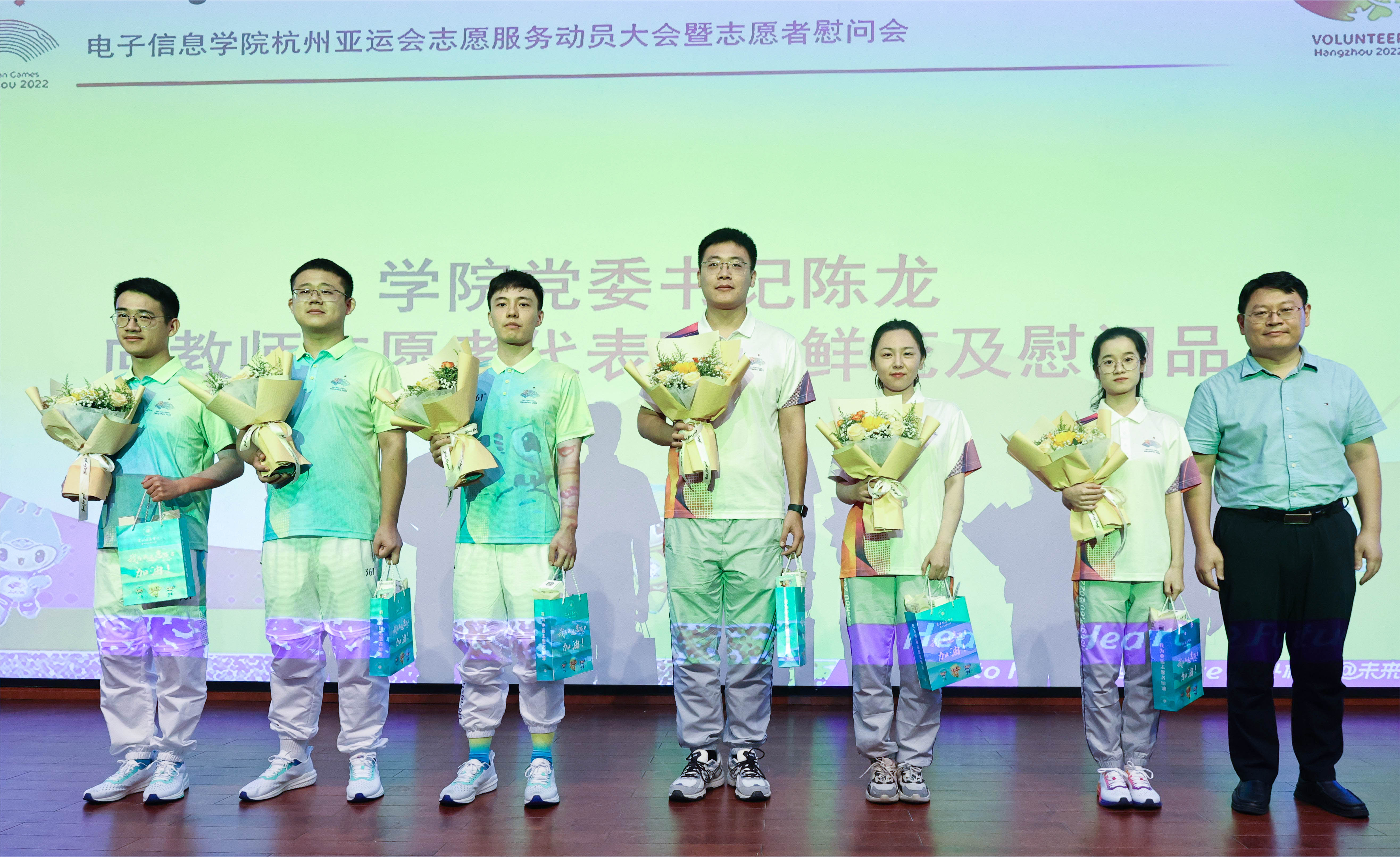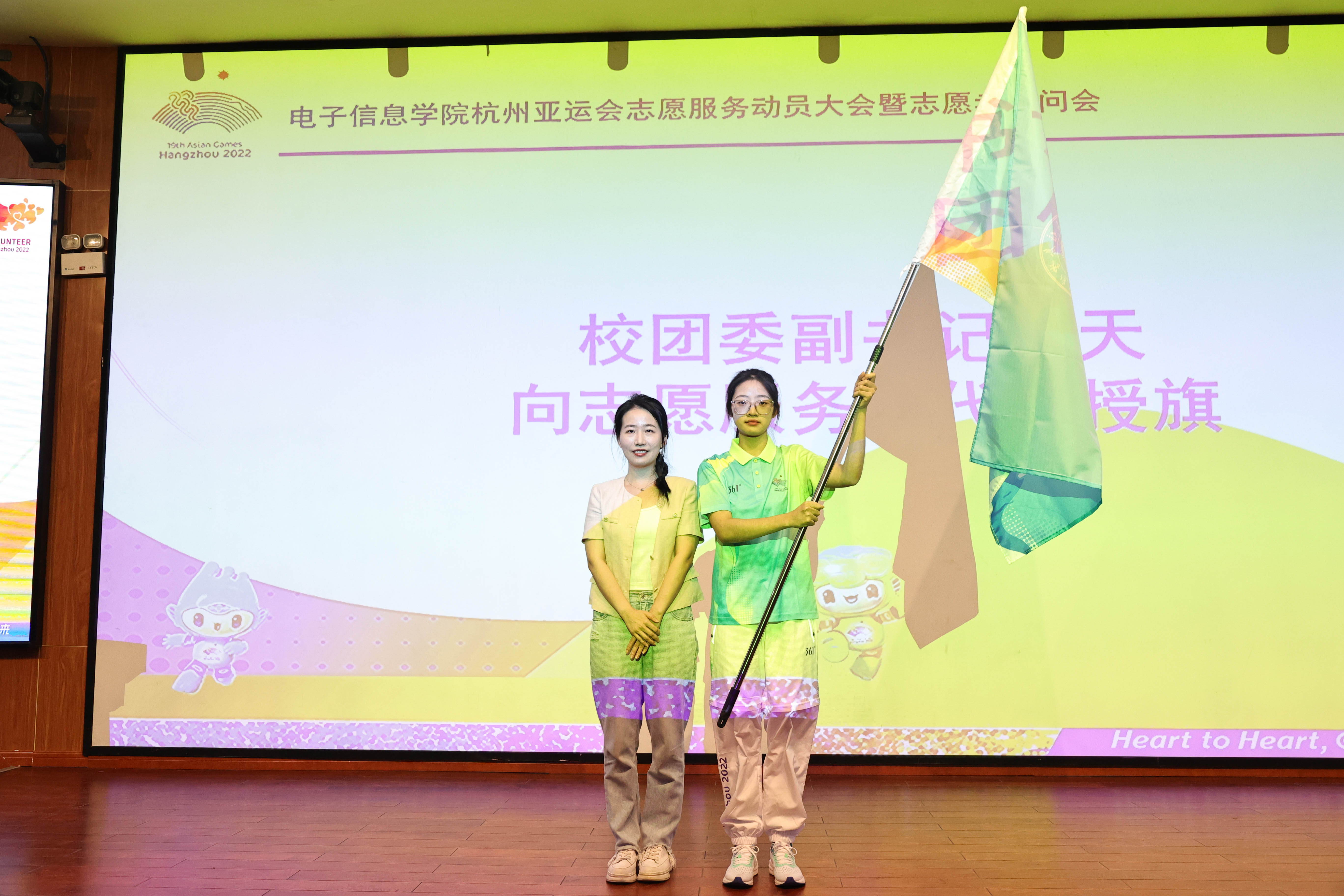 电子学院包括老师在内的150名志愿者和工作人员承担了击剑、网球等项目的志愿服务,为增强学院亚运志愿者队伍凝聚力,学院成立杭州亚运会志愿服务团,高天为志愿服务团代表授旗。