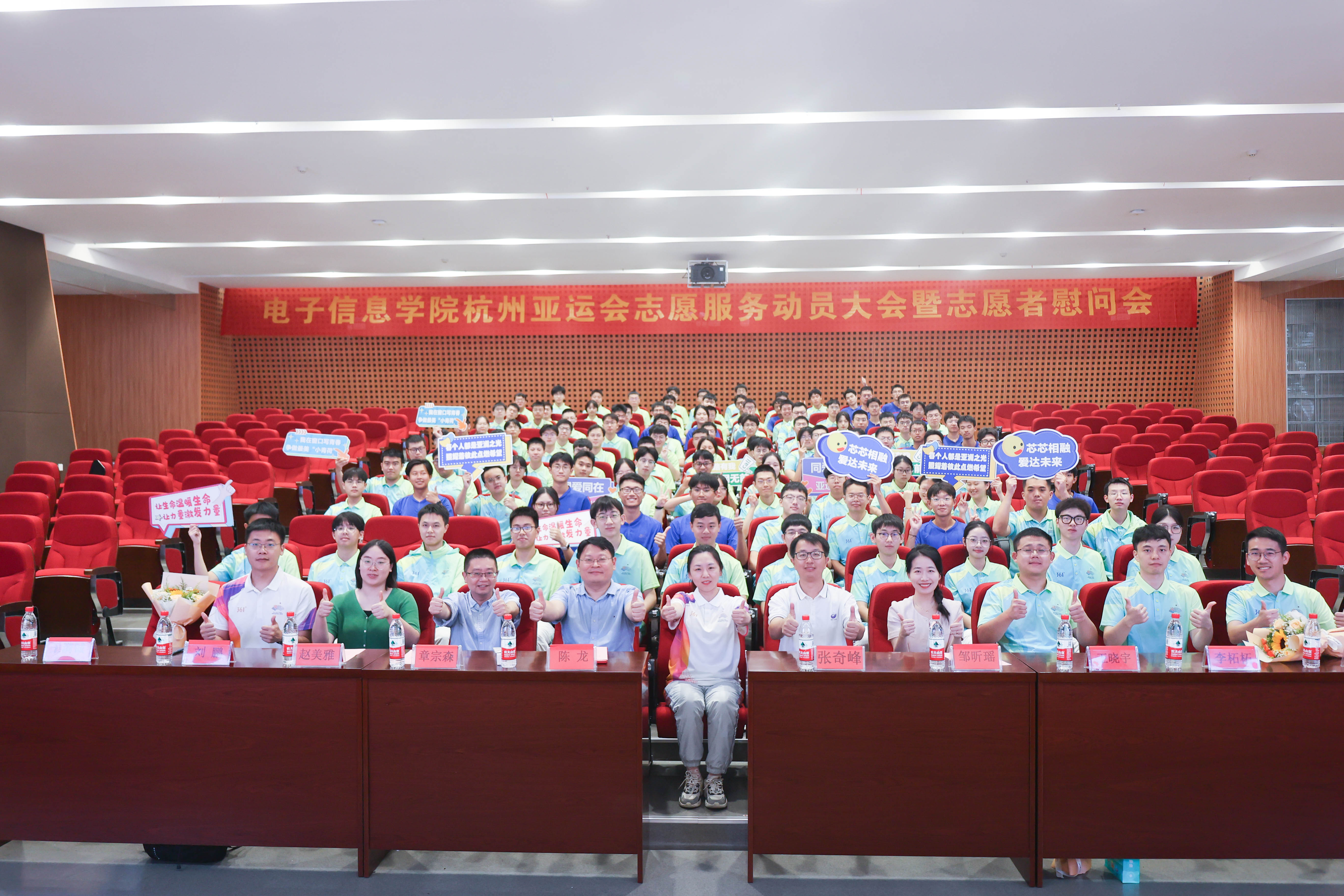 9月21下午,电子信息学院在4教127召开亚运志愿者动员大会暨慰问会,为学院亚运志愿者们加油鼓劲。学院党委书记陈龙,学生处副处长、奥体中心网球中心运行团队人事/志愿者副主任张奇峰,学院党委副书记章宗森,校团委副书记高天,学院学工办主任赵美雅以及奥体中心网球中心志愿者领队老师王晓宇等近150名学院教师、学生亚运志愿者代表出席会议,学院团委书记许奕韬主持会议。