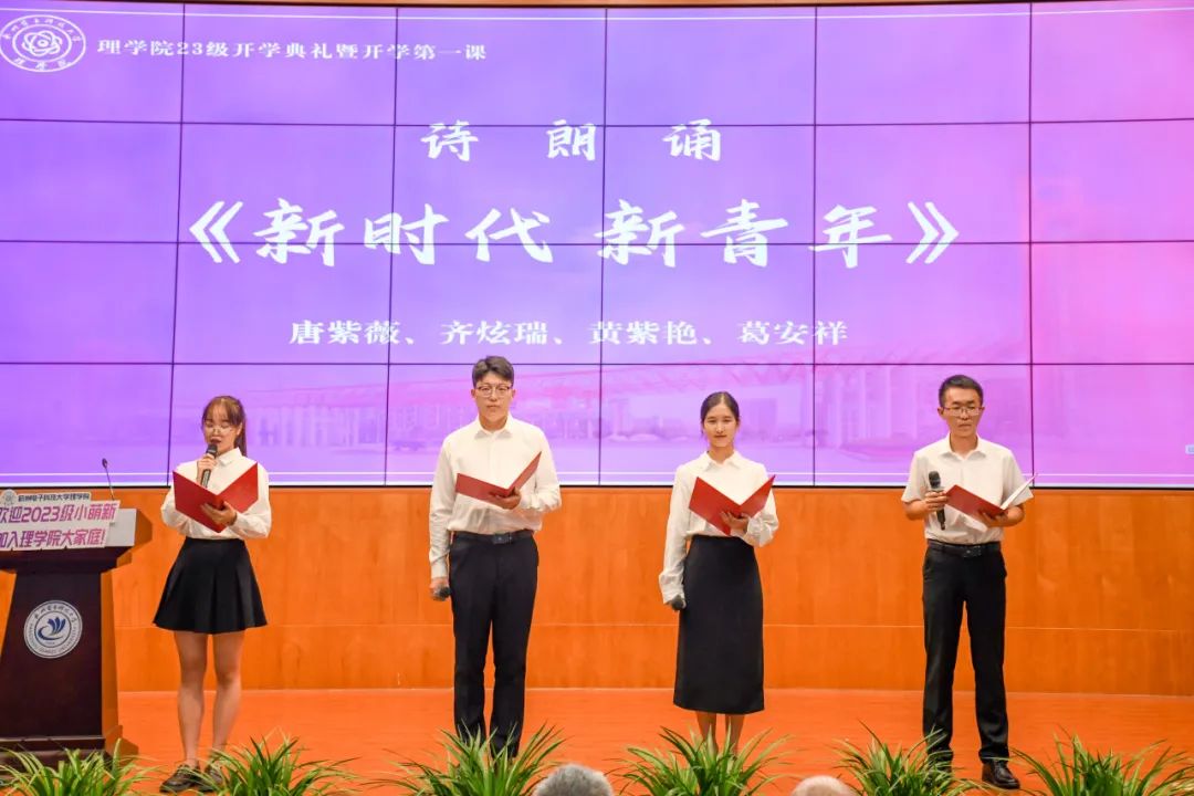 全国各地的理学院校友也为新生们发来了寄语视频,回顾大学时光并希望同学们珍惜大学时光,勇于拼搏,不悔青春。新生辅导员齐炫瑞、葛安祥、唐紫薇和黄紫艳同学为新生带来诗朗诵《新时代,新青年》。振奋人心的诗篇激励每一个新生勇敢地面对未来的挑战,担负起时代的重任,以梦为马,不负韶华,用青春和热血书写属于自己的辉煌篇章。
