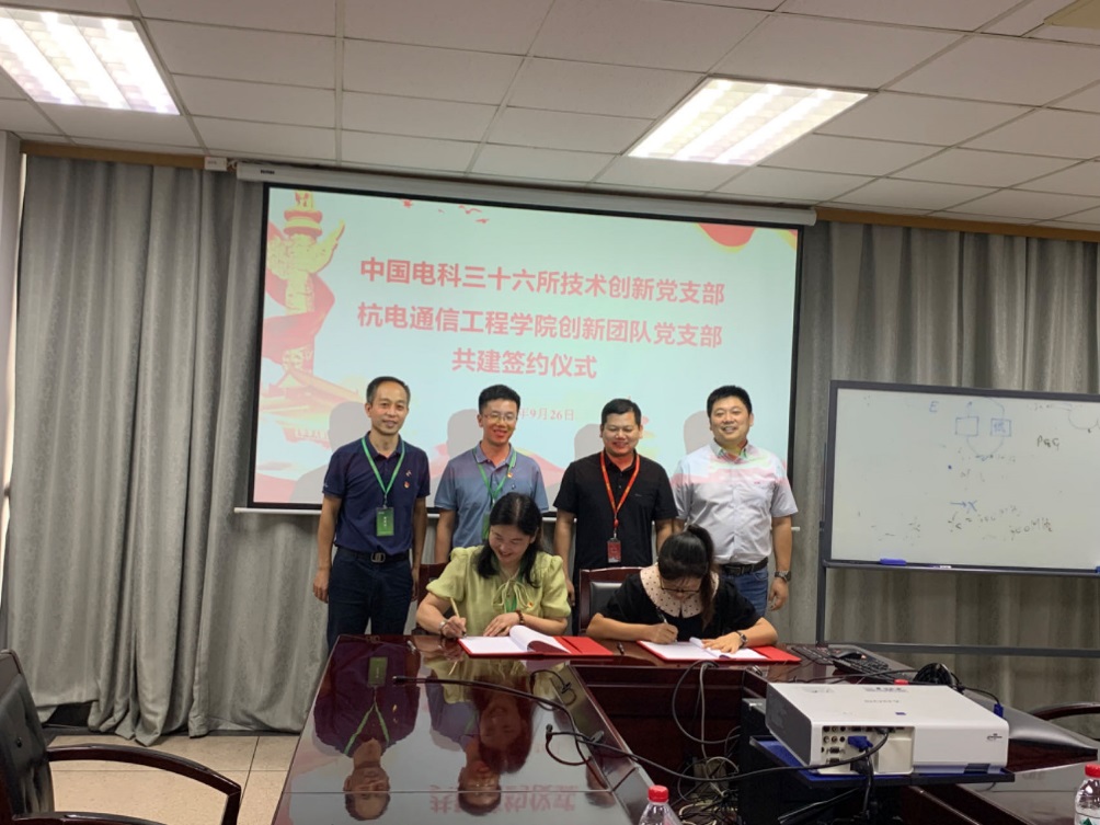 为贯彻落实习近平总书记关于实现科技自立自强、培养卓越工程人才的重要指示精神,构建“互促互助、优势互补、共谋发展”的党建合作新格局,9月26日,通信工程学院党委书记何宏、副院长孙闽红、创新团队党支部书记周雪芳赴中国电科三十六所,与技术创新党支部举行支部共建签约仪式,并一同看望慰问联合培养研究生。三十六所组织人事部主任顾俊杰、党建工作部主任殷建良、技术创新部主任王巍、技术创新党支部书记李焕及组织人事部主任助理张德华、导师代表张琦、全体联培研究生出席活动。