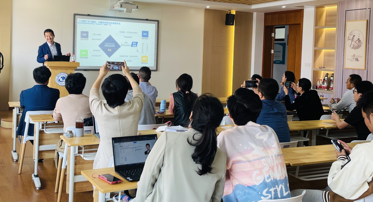 项益鸣教授详细介绍了以Lighthouse互联网实验室为平台,多元融合、合作共赢的教学体系与教学模式设计。项益鸣指出,人才培养需要深入了解社会需求,要理论联系实践,除了创设优质课堂,还要多为学生创造实践的机会,鼓励和指导学生参与学科竞赛,提高学生解决问题的能力。