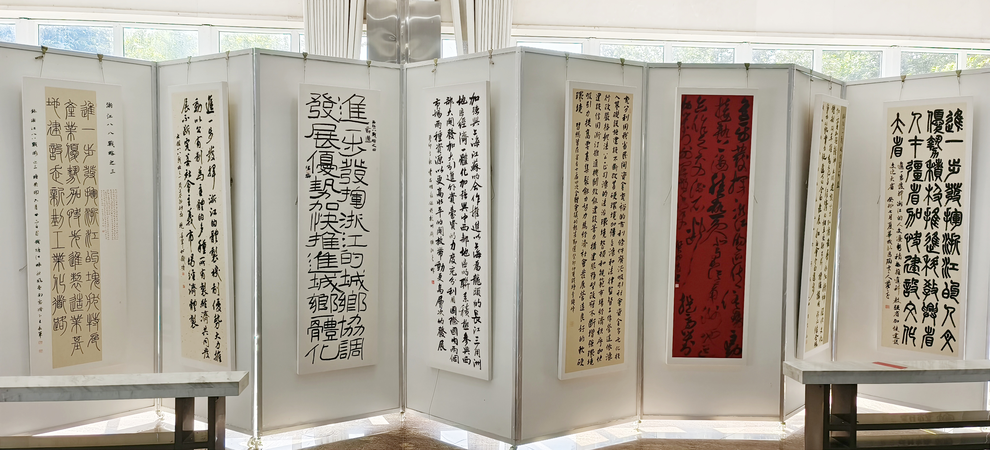 本次展览,我校老师、校友和钱塘区的书法家、篆刻家们以书法、篆刻等艺术形式,紧密围绕“八八战略”展览主题,用手中的毛笔描绘和记录日新月异的社会变革,全面呈现新时代浙江人“勇立潮头”的新作为,表达了浙江人民秉持浙江精神,“干在实处、走在前列、勇立潮头”的坚强决心和美好前景。