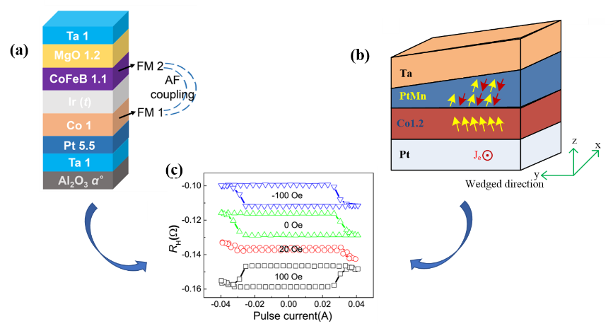 利用自旋轨道矩(SOT)翻转垂直磁化的铁磁或反铁磁层的自旋电子器件被认为是“后摩尔时代”磁存储和逻辑计算的重要候选者。传统方式下,SOT驱动垂直磁矩翻转通常需要引入外磁场打破其反演对称性、严重影响了自旋电子存储器件的能效和可集成性。团队成员开展了电流驱动的无磁场翻转自旋存储器件研究,通过斜切衬底和楔形反铁磁层未补偿磁矩打破对称性,实现无磁场翻转。团队成员利用沉积在斜切Al2O3基底上的垂直磁化的Co/Ir/CoFeB人工反铁磁结构[3],以及Pt/Co/PtMn(楔形)三层薄膜结构来打破横向结构对称[4],提高了SOT翻转效率,并增强了阻尼类场(HDL),最终都实现了垂直磁矩的无磁场翻转,有望在下一代磁性存储器件中得到广泛应用。