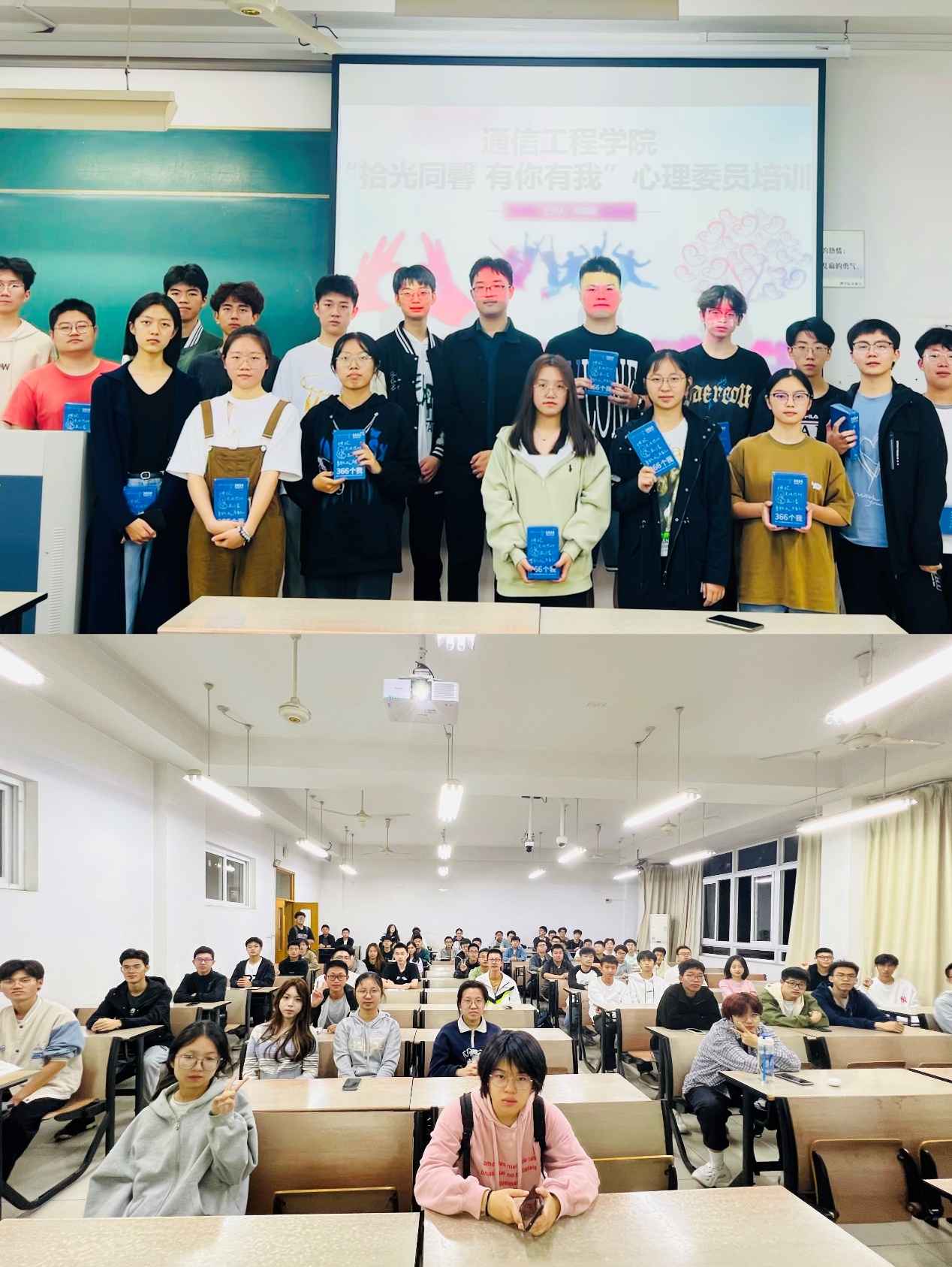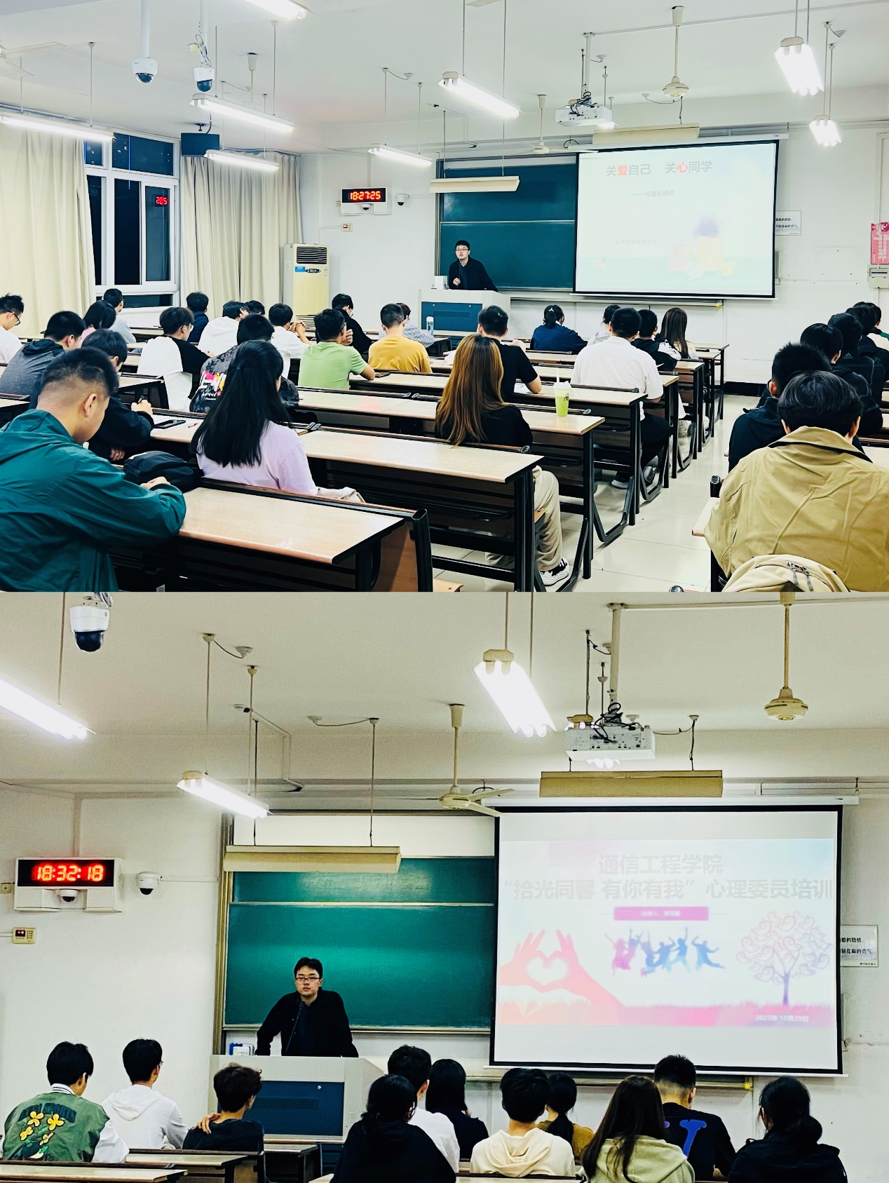 为加强学生心理健康教育水平、培养学生健康的心理状态、帮助学生了解心理预警机制、打造和谐互助的学习和生活氛围,结合学院“拾光同馨”学工文化心理育人理念机制,10月22日、29日,通信工程学院相继开展“拾光同馨 有你有我”主题的寝室长培训会和心理委员培训会。通信工程学院心理站站长、辅导员吴马超担任主讲,对全体新生寝室长、学院心理委员进行培训。