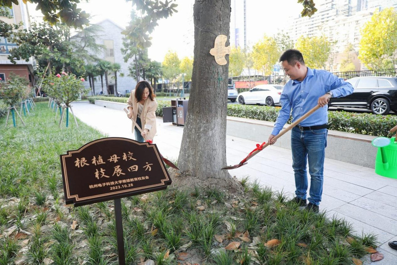 (校友代表王艳、汪科友为认养树木“鹏博树”填土浇水)