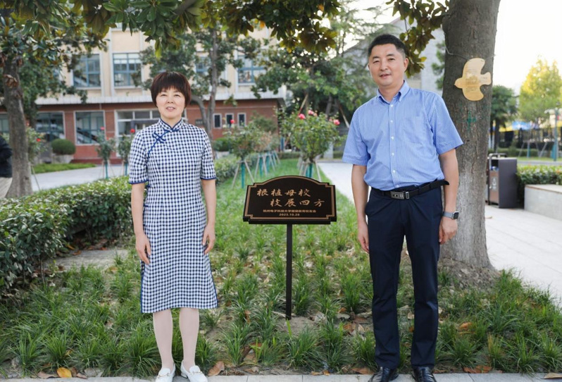 (副校级领导郝敬习、校友会新任副会长宁铁晖为“鹏博树”揭牌合影)