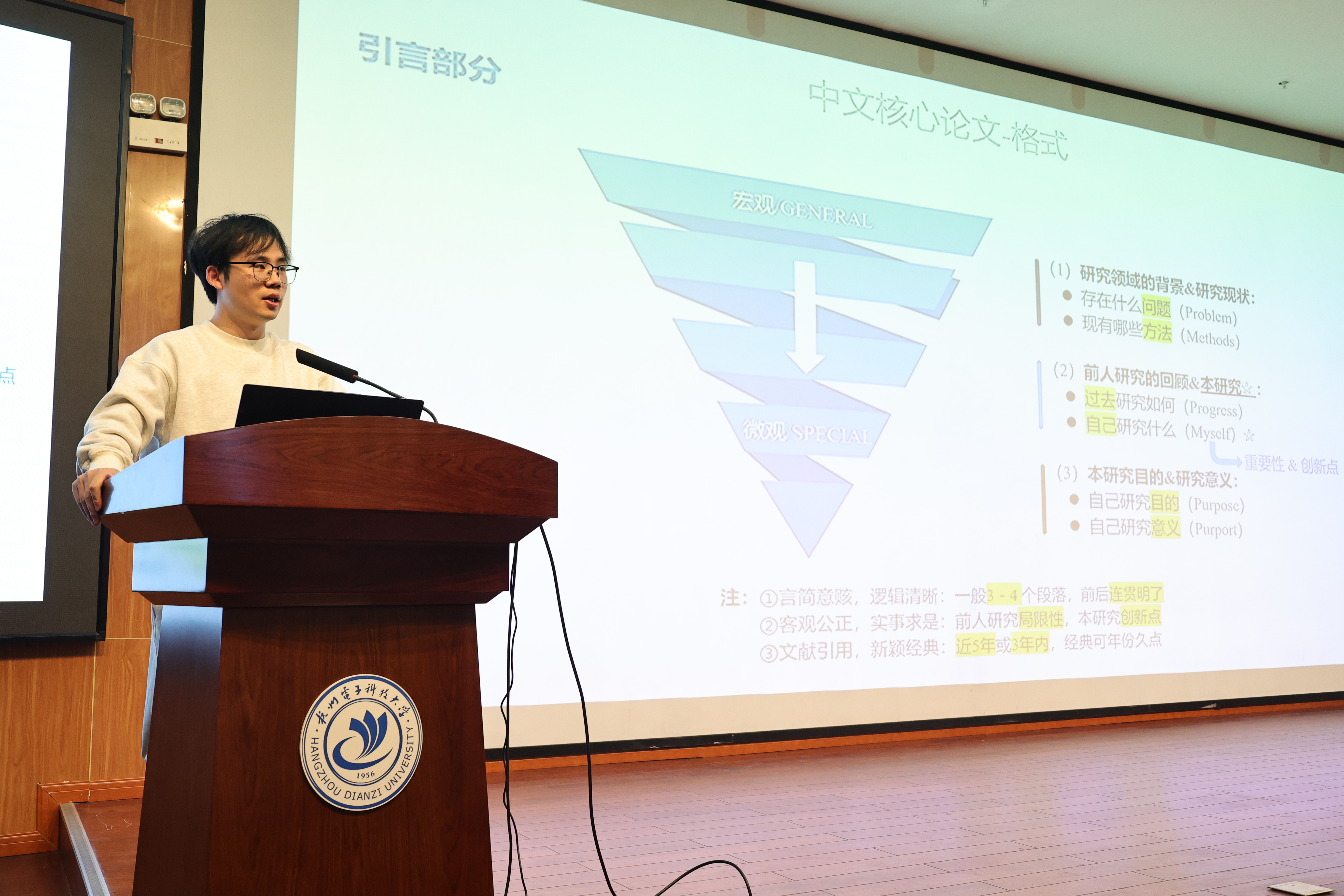 张煜培主要给大家归纳了有关中文核心论文的写作技巧,此次的分享内容涵盖方方面面,其中重点包括了“中文核心论文的格式”、“中文核心论文训练方法”、“如何寻找论文的创新点”以及“如何选择期刊”等。本次分享的目的是让同学们在自身的研究方向上更快地熟悉入门,并且为将来独立完成自己的第一篇小作文打下基础。