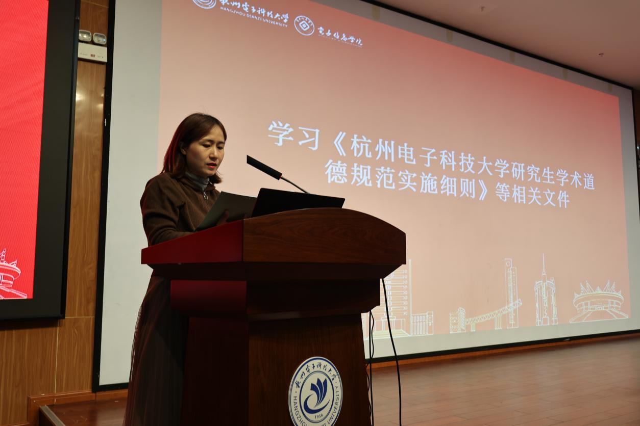 活动开始,由研教办主任洪盈盈带领23级电子信息学院研究生新生学习《杭州电子科技大学研究生学术道德规范实施细则》等相关文件。洪老师告知同学们,学术道德是任何科研工作者需遵守的基本伦理和规范,要加强学术规范建设,治理学术不端行为,形成坚守学术诚信、完善学术人格、维护学术尊严的良好氛围。