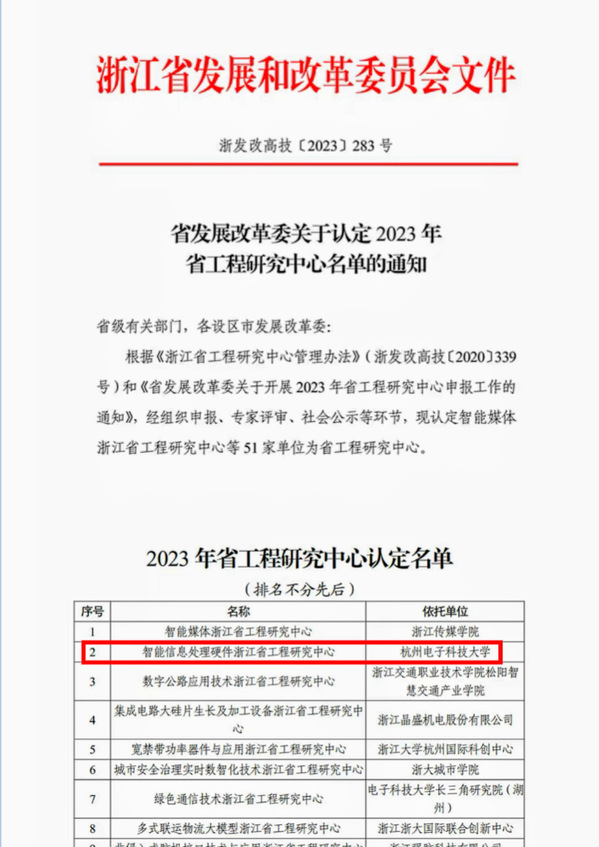 近日,浙江省发展和改革委员会发布《省发展改革委关于认定2023年省工程研究中心名单的通知》,杭州电子科技大学通信工程学院成功获批“智能信息处理硬件浙江省工程研究中心”。