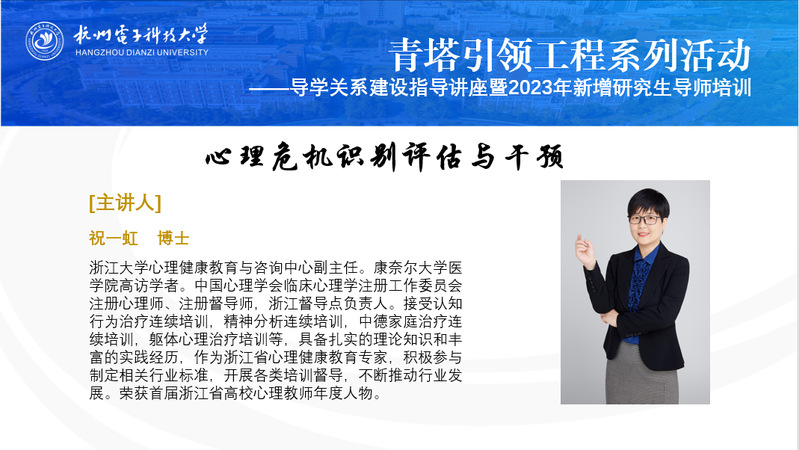 2023年11月9日下午14点,研究生青塔引领工程系列活动——导学关系建设指导讲座在学校前沿技术研究中心四教127报告厅顺利举办。本次活动由党委研究生工作部、研究生院主办,邀请到了浙江大学心理健康教育与咨询中心副主任祝一虹博士,为大家做主题为“抑郁及心理危机的识别与干预”的讲座。学校新增研究生导师和各学院研究生辅导员到场聆听。
