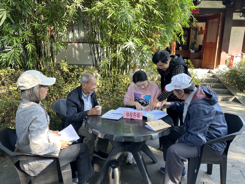 本次品茗活动现场分三个区域布置。在主通道附近设置咨询服务区,有党员志愿者为大家办理签到手续,并现场发放数百份体检报告,浙大一院、省人民医院、省中医院、省立同德医院专家和校医院院长周杭等在现场提供健康咨询与医疗政策服务。在室内和露天活动小园地设置党员学习谈心区,离退休党委机关二、电子信息等党支部组织党员开展主题党日活动。在廊道设置休闲交流区,老同事们精神饱满,谈笑风生,大家以茶会友话当年、赏秋谈心忆友情,乐享美好生活。退休教授盛宗申自费出版的第五辑《散文集》也在活动中发放传阅,增添了活动的文韵和诗意。