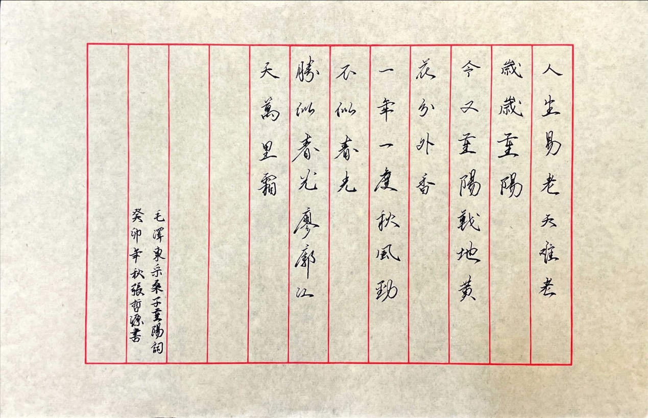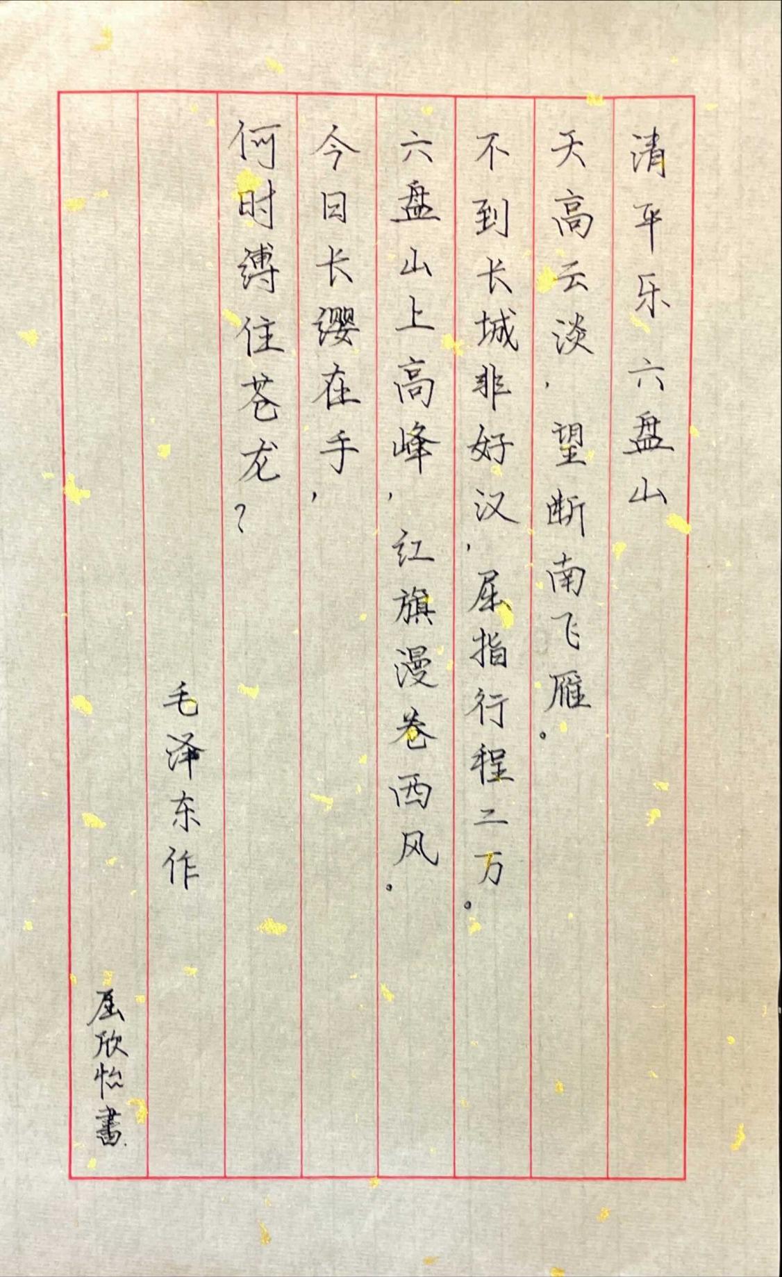 一张洒金宣纸、一支钢笔,学生们摘录着自己喜欢的、有思悟的诗词语句。有出乡求学时,“孩儿立志出乡关,学不成名誓不还”的志存高远,也有正值青春年少时,“恰同学少年,风华正茂”的意气风发,更有长征路上踏平险阻时,“雄关漫道真如铁,而今迈步从头越”的英雄豪气,句句发人深省。史维老师希望,毛主席的诗词不仅可以让同学们回首历史、感悟当中强烈的历史观和人民情怀,而且可以对大家当前和未来的发展起借鉴和指引作用,汲取新时代、新征程中的奋进力量,激发大家的共鸣、深思和拼搏奋进的热情。