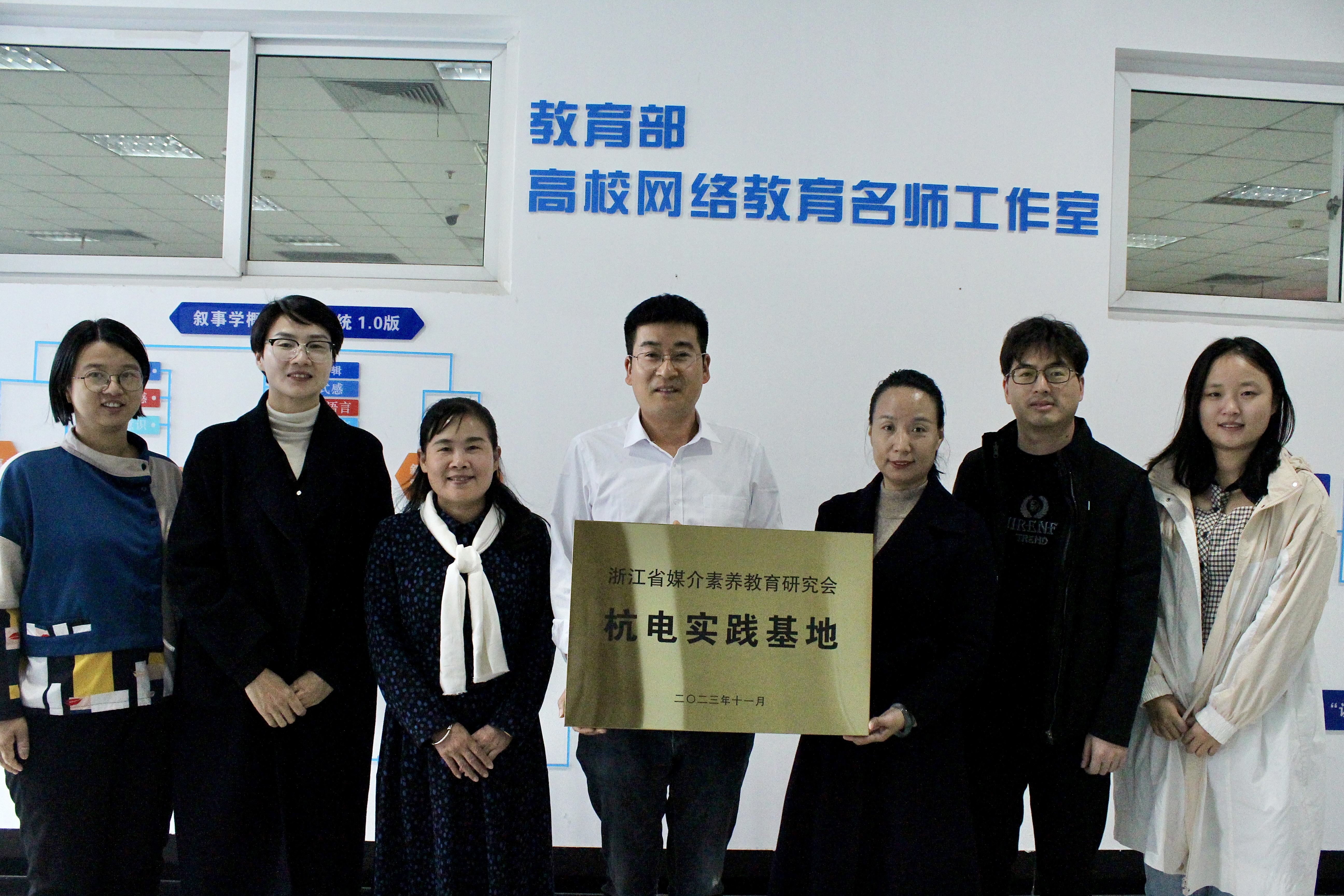 11月22日,浙江省媒介素养教育研究会杭电实践基地挂牌仪式在杭电名师工作室举行。杭州电子科技大学宣传部副部长程振伟、新闻科科长楼威,浙江省媒介素养教育研究会副会长、浙江传媒学院宋红岩教授,浙江省媒介素养教育研究会副秘书长王圣策和浙江传媒学院媒介素养研究所科研秘书边慧琳出席本次仪式。