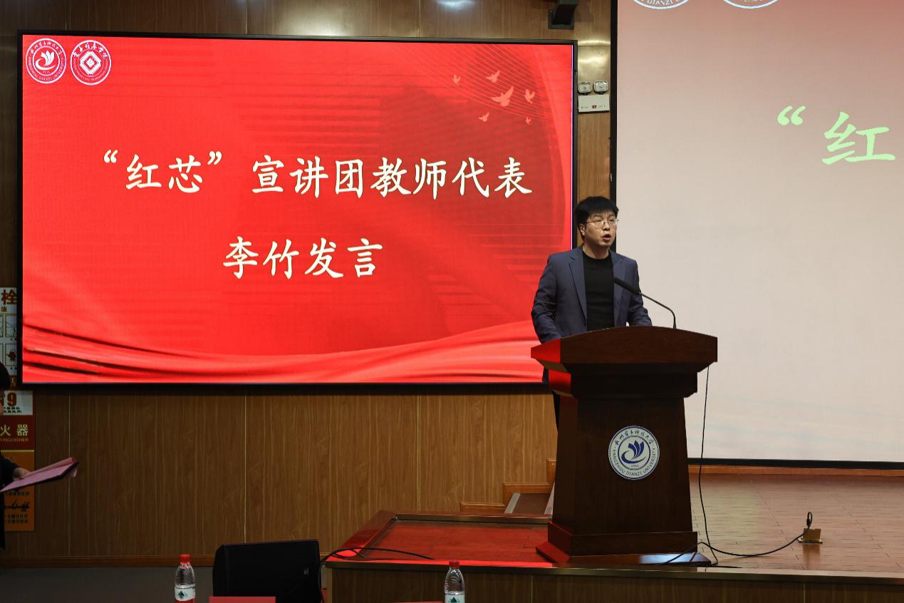 仪式中,宣讲团成员胡文浩作为学生代表发言,他表示将在宣讲中积极传递科研热情,和同学们一起勇攀科技高峰,为国家科技创新贡献自身力量。宣讲团成员李竹作为教师代表发言,他表示将积极创新教学方法和手段,挖掘课程中蕴含的思想政治教育资源,发挥好讲台的作用,传播“中国芯”故事。