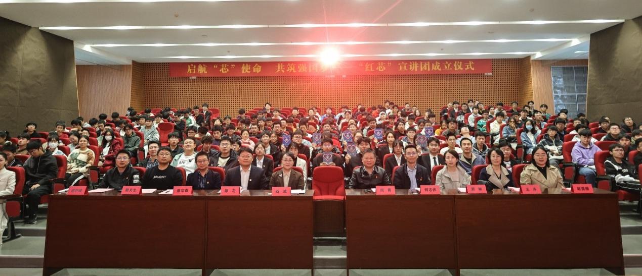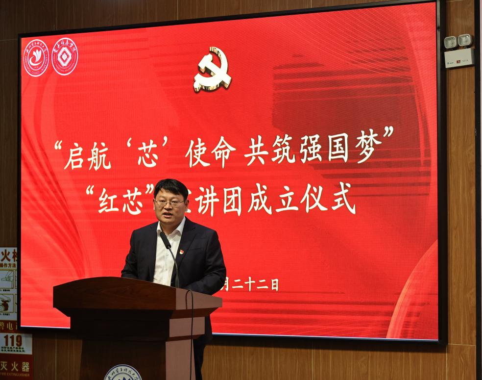 电子信息学院“红芯”宣讲团成员主要由学院党政领导、学院党委委员、学院优秀师生代表组成。“红芯”中的“红”代表着宣讲团坚持中国共产党的领导,“芯”表明学院助力国产芯片事业发展、培养破解“卡脖子”难题的芯片人才的决心。